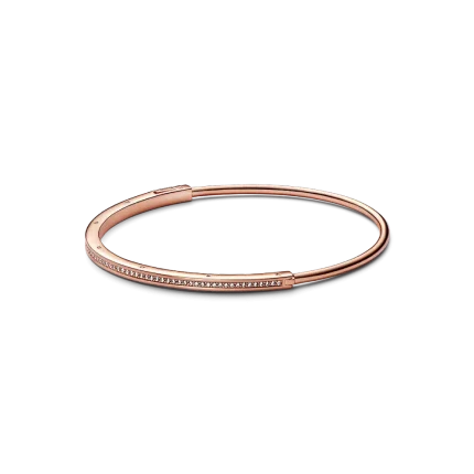 Elevate your outfit with the Pandora Signature I-D Pavé Bangle. Finished in 14k rose gold plating, this much-loved design features