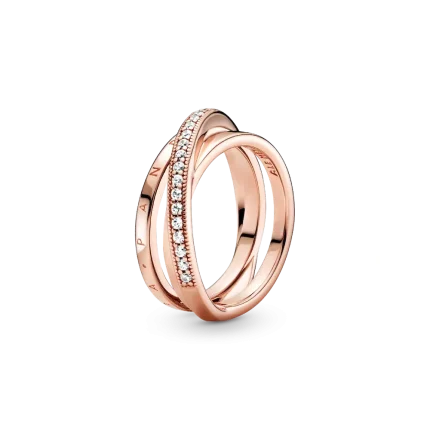 Triple your style with the Crossover Pavé Triple Band Ring. This classic yet modern 14k rose gold-plated ring boasts three