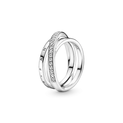 Go for linear layers with the Crossover Pavé Triple Band Ring. This Sterling Silver ring features three bands, with one