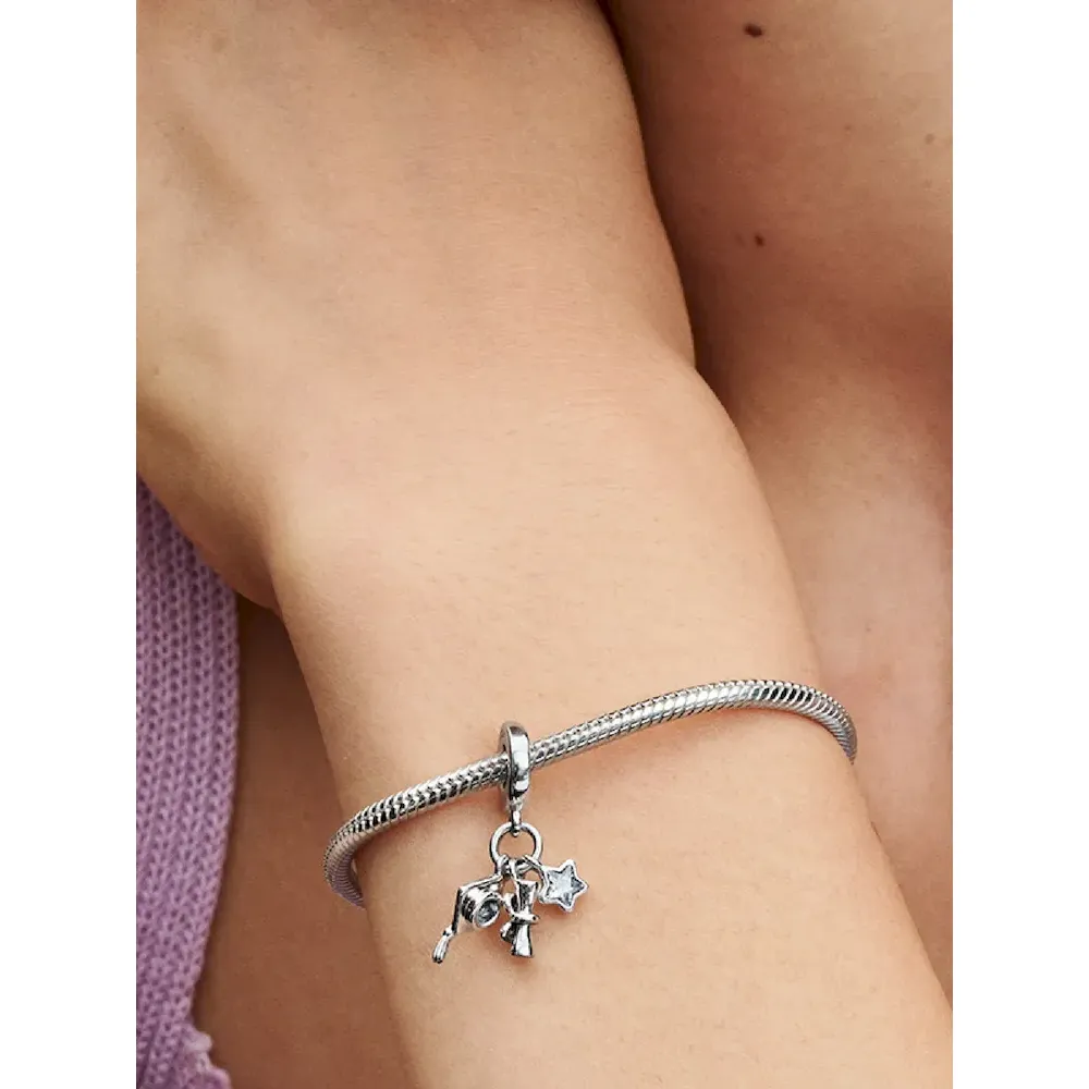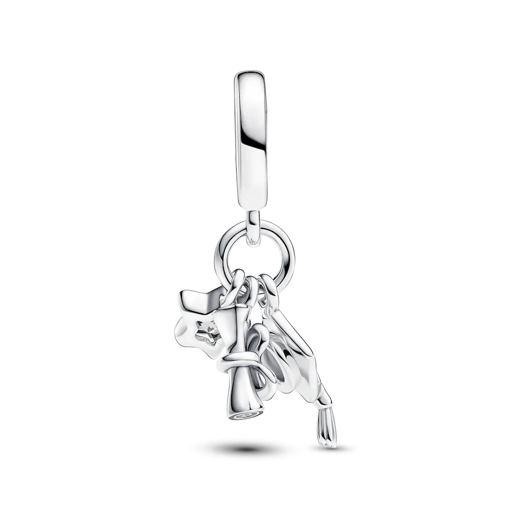 Celebrate your milestone with our 2024 Graduation Triple Dangle Charm, a sterling silver charm capturing the essence of achievement. A star-shaped cubic zirconia gleams alongside a dangling graduation cap with a tasselled flair and a detailed scroll featuring a bow-tied ribbon. The swirling lines depict a rolled diploma, while the ‘2024’ engraving on the bail adds a personalized touch. This charm serves as a sweet reminder of your dedication and success in the journey of education.