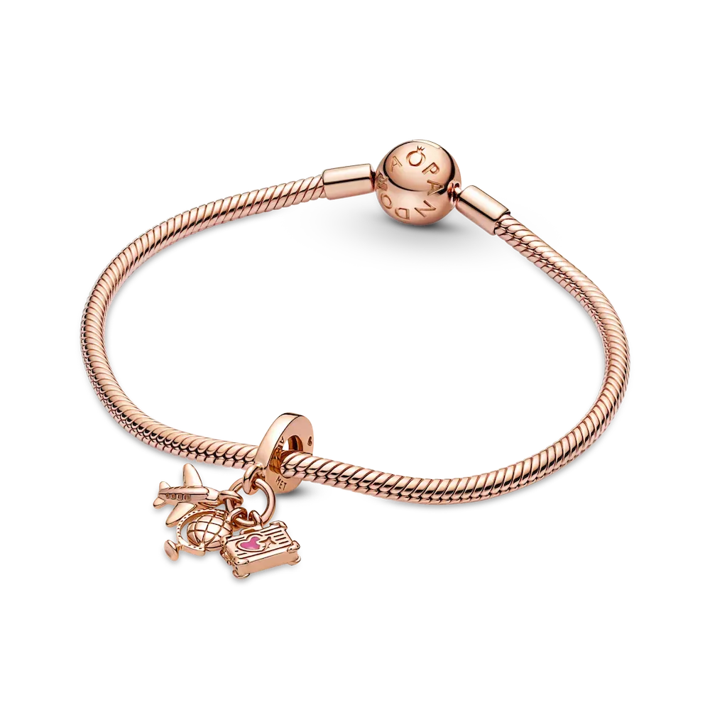 Fly away on a dream adventure with this 14k rose-gold plated travel charm. This triple dangle charm features three symbols of travel: an airplane, a globe and a suitcase with lifelike corner details and a tiny pink enamel heart. Style it on your Pandora Moments pieces to carry your travel memories with you and look forward to new adventures.