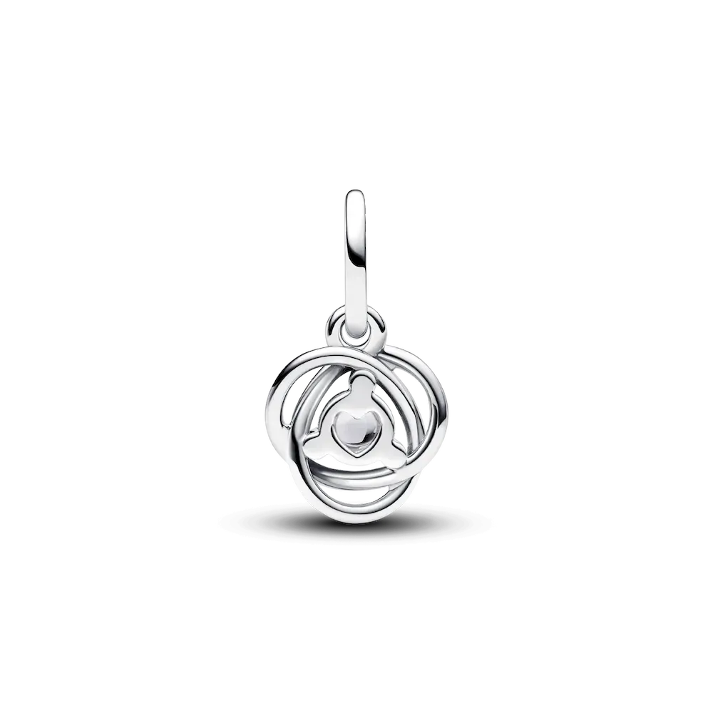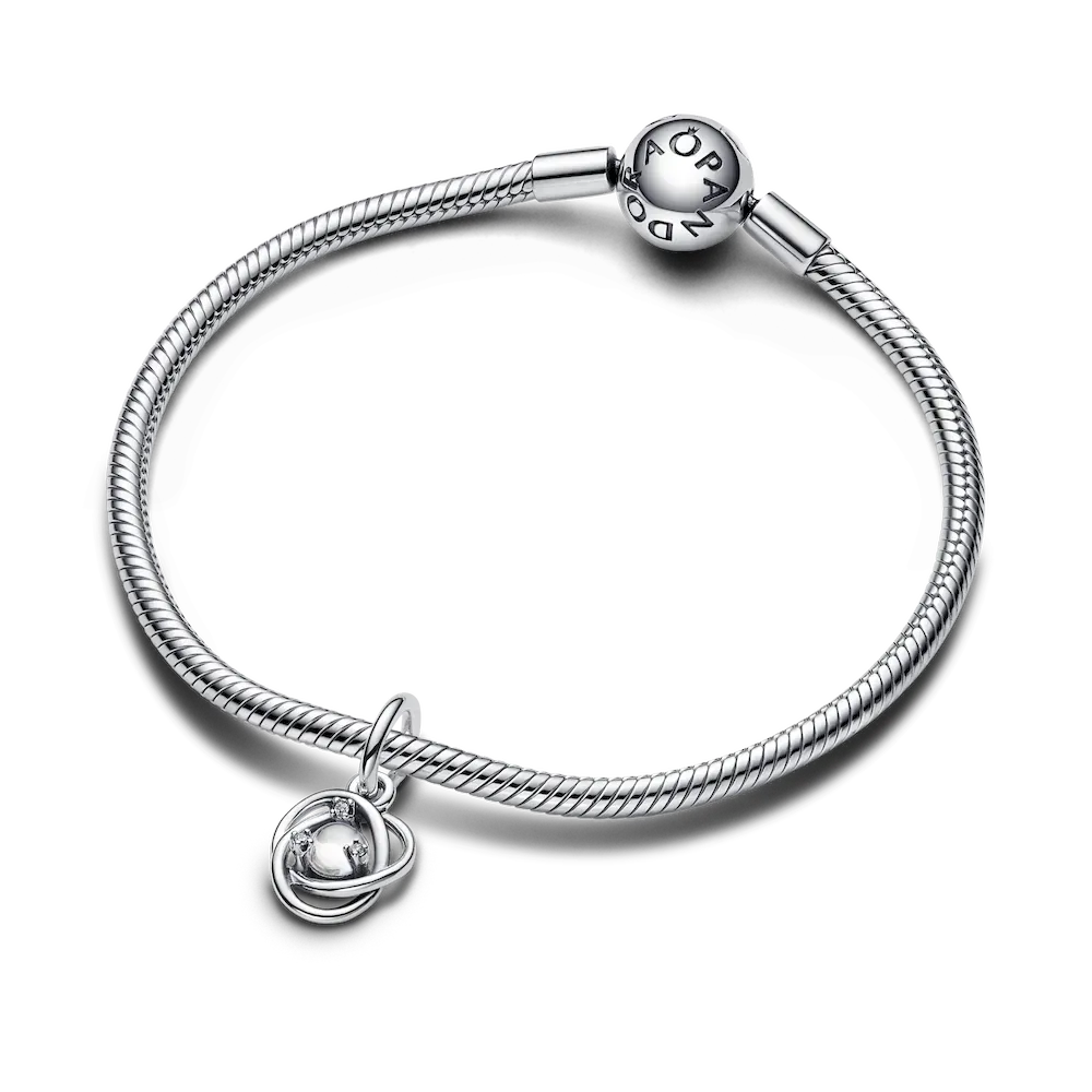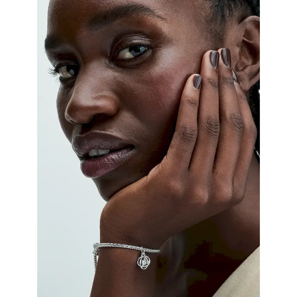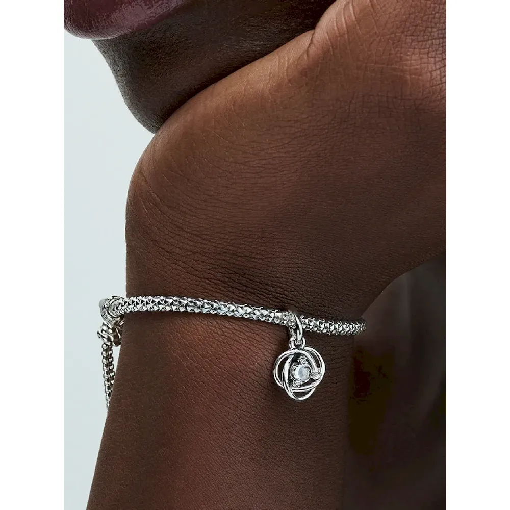 Introducing a new addition to the Eternity Circle family with our Stones of the Month dangle charms. Inspired by unconditional love and power, this intricate knot design features openwork infinity braiding around April’s clear man-made cubic zirconia at the center. Surrounded by three additional small cubic zirconia stones on the front and a cut-out heart shape on the back for maximum sparkle. This dazzling dangle charm comes on a matching sterling silver Pandora Moments Snake Chain Slider Bracelet. Capture the symbolism of an April birthday, milestone or anniversary with this shimmering set. Unconditionally. Infinitely. Be love.