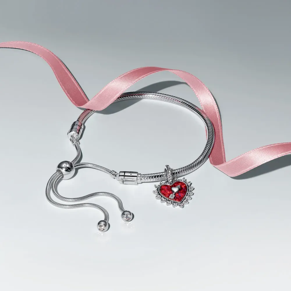 Let Cupid’s arrow guide you to the perfect gift set. Styled on our iconic sterling silver slider bracelet, a dazzling heart-shaped charm shines irresistibly in red lab-created opal. The center features a heart-shaped dial with a spinning arrow, pointing you in the direction of love. Follow your heart. Be love.