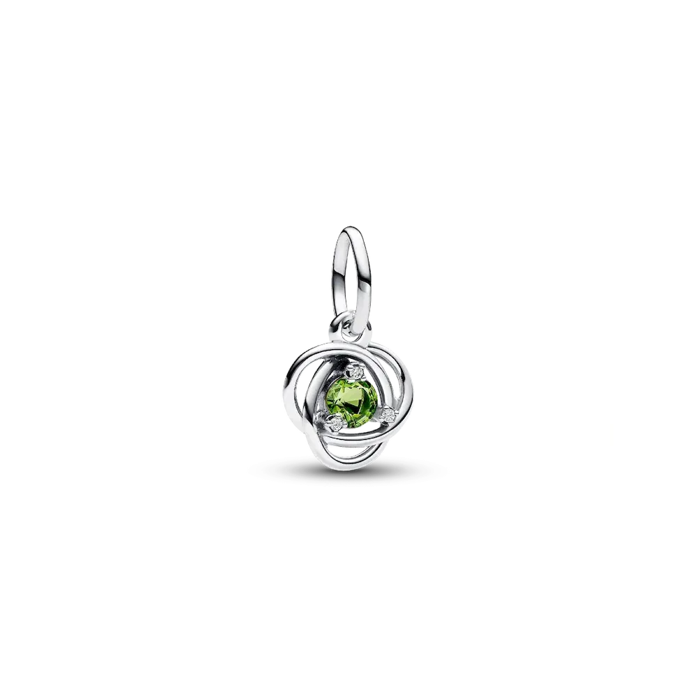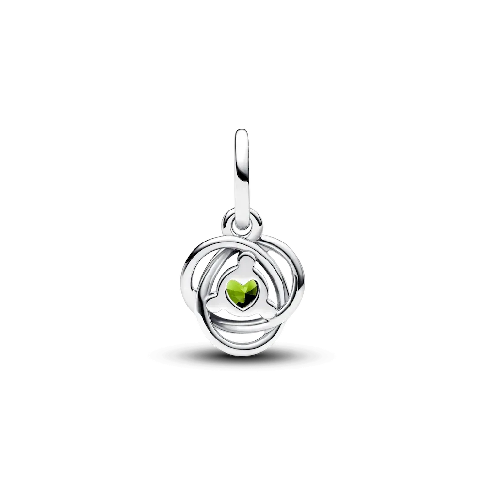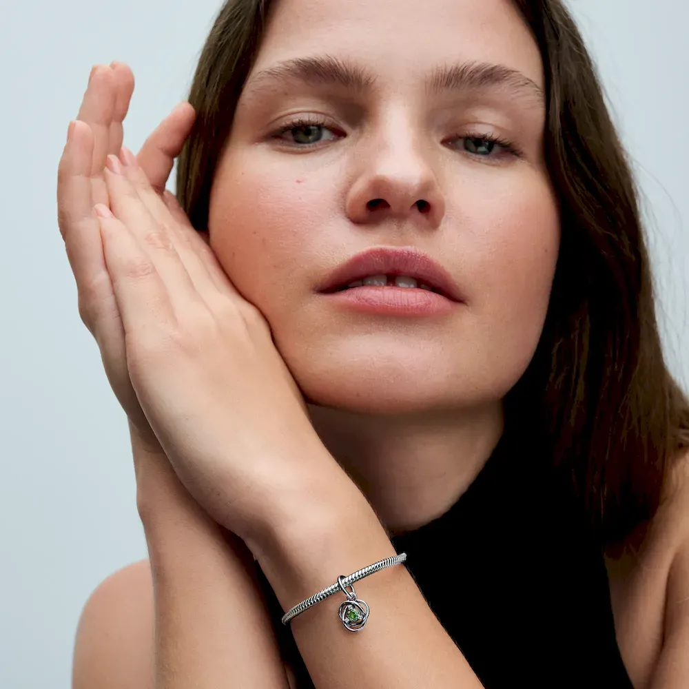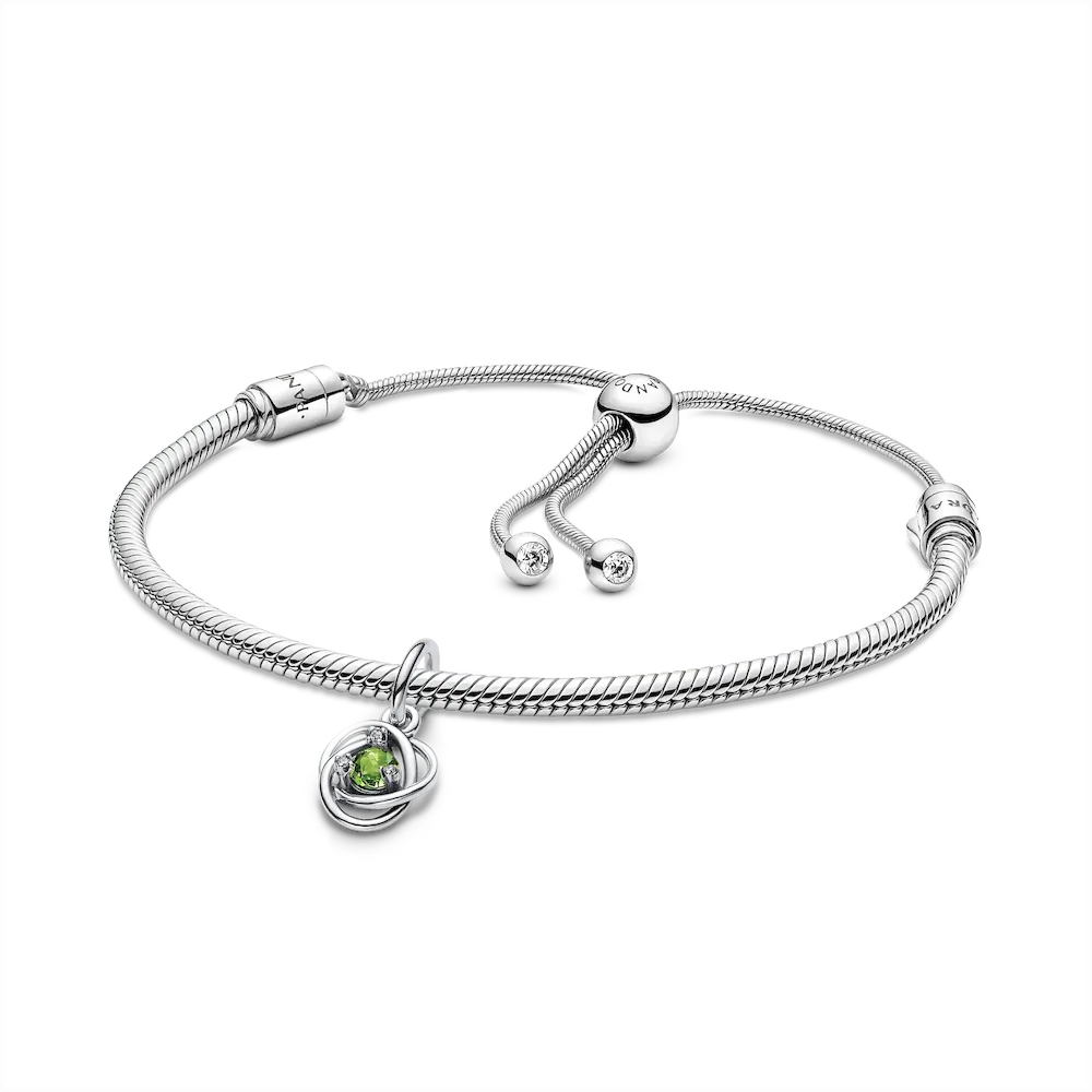 Introducing a new addition to the Eternity Circle family with our Stones of the Month dangle charms. Inspired by unconditional love and power, this intricate knot design features openwork infinity braiding around August’s Spring green man-made crystal at the center. Surrounded by three small cubic zirconia stones on the front and a cut-out heart shape on the back for maximum sparkle. This dazzling dangle charm comes on a matching sterling silver Pandora Moments Snake Chain Slider Bracelet. Capture the symbolism of an August birthday, milestone or anniversary with this precious set. Unconditionally. Infinitely. Be love.