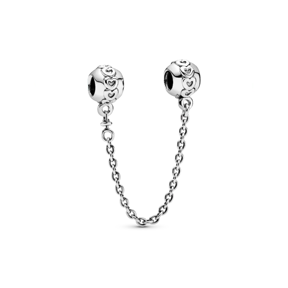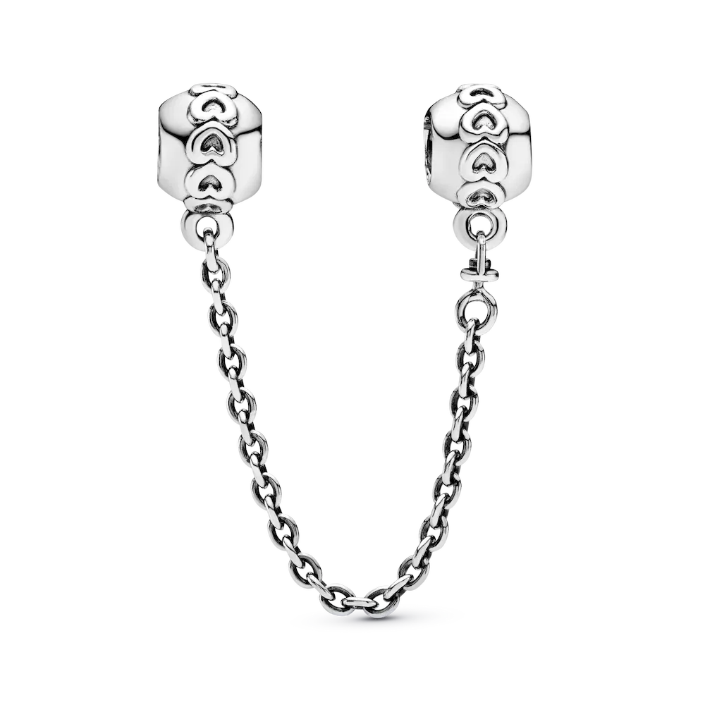 Complete your bracelet styling with a romantic touch. Hand-finished in sterling silver, this pretty Pandora safety chain keeps your charms safe on any Pandora Moments bracelet. The safety chain is minimally detailed with raised hearts around each clasp and its swivel ends prevent the chain from tangling while you wear it. Thread one side onto your bracelet before adding charms, connecting the unattached side of the safety chain on the other end once your charms are in place.