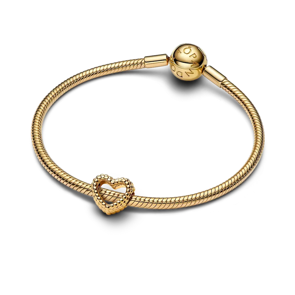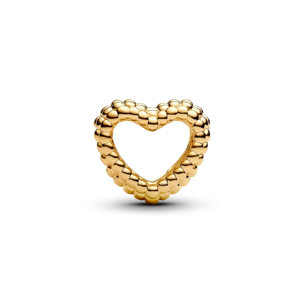 Feel the love with our 14k gold-plated Beaded Open Heart Charm, perfect for adding depth and dimension to a charm bracelet. The open design is minimally detailed with a beaded silhouette. Thread it on a favorite Pandora Moments bracelet or bangle, adding other pieces that tell your story in a way that’s uniquely you.