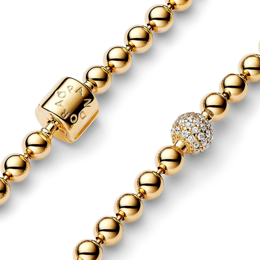 When you want to wear chunky and edgy beads with an elegant twist, choose the Beads & Pavé bracelet in our 14k gold-plated unique metal blend. The bracelet draws inspiration from the alternative looks of body piercings and punk styles with a polished, refined twist. It features a fully beaded chain with one slightly larger pavé-set bead and a barrel clasp. This Pandora bracelet can be worn alone or stacked with other styles in different metal finishes for an individual look.