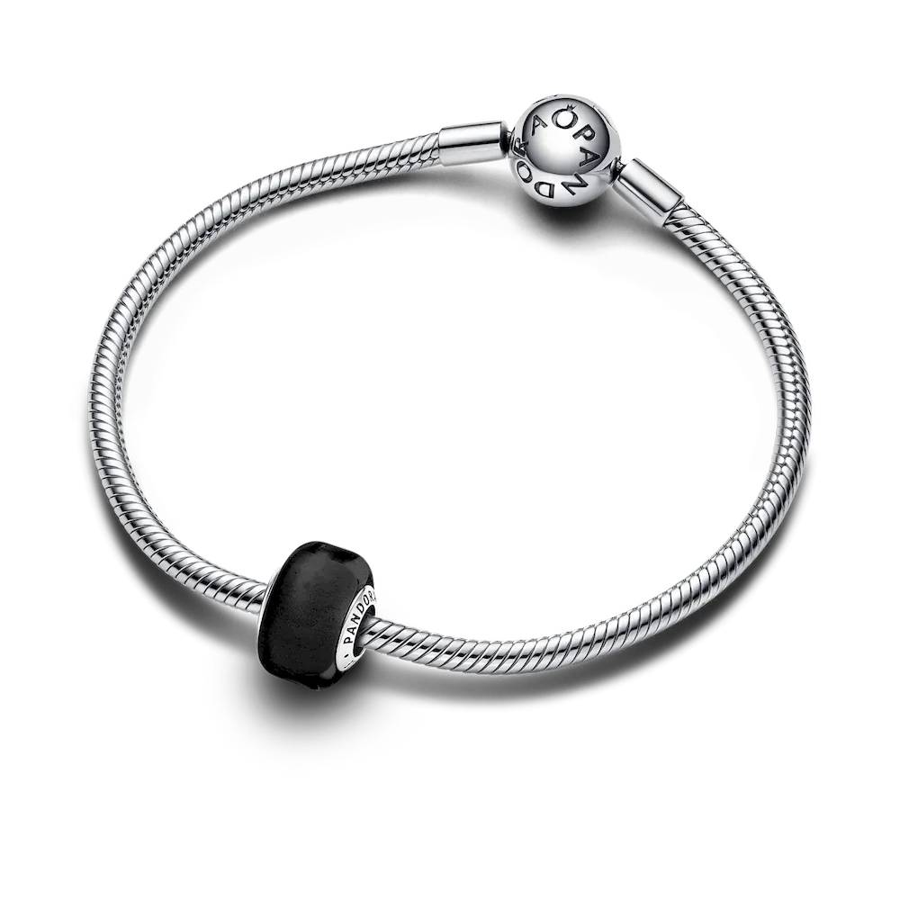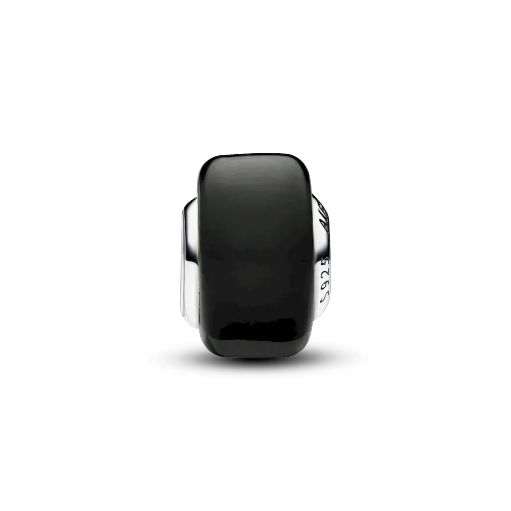 Add impact to your charm styling with our Black Mini Murano Glass Charm. This new charm design has a smaller size than our other Murano charms and a slightly squared shape, creating new ways to play with colour and dimension in your charm line-ups. The core is made from sterling silver and fits on any Pandora Moments charm holder. Pair it with your favourite sterling silver charms or get creative and mix with the same style in other colours.