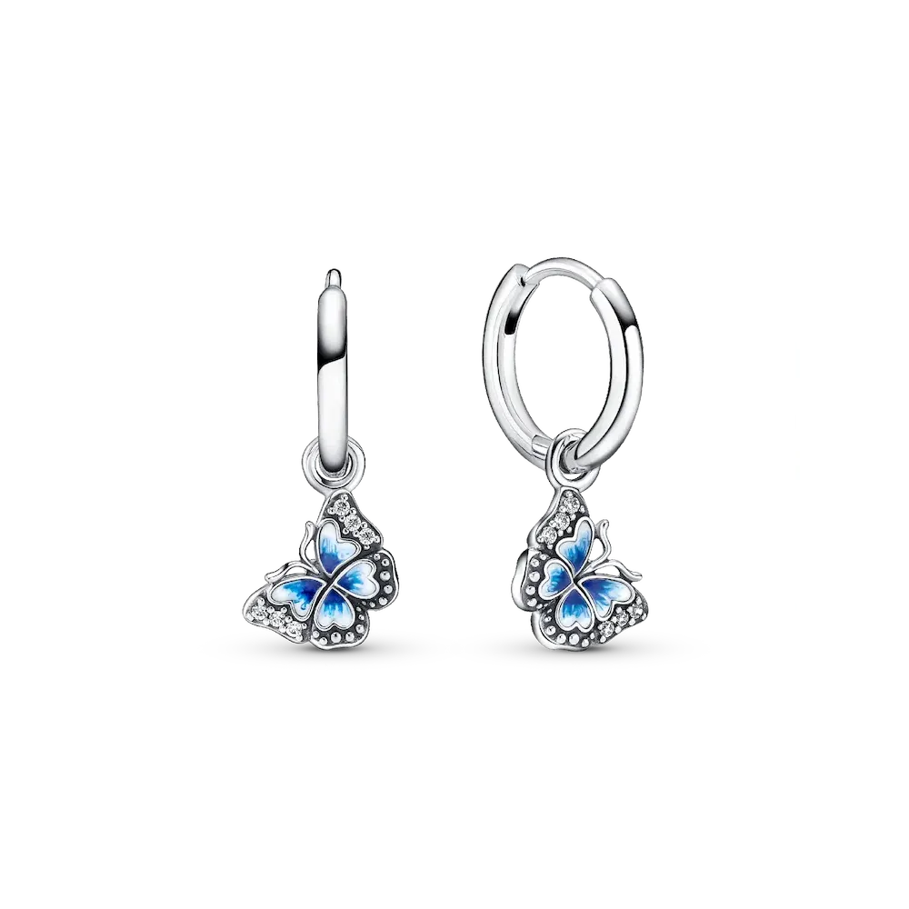 Add spring inspiration to your everyday look with our Blue Butterfly Hoop Earrings. Featuring hand-painted enamel wings and sparkling brilliant-cut clear cubic zirconia, each butterfly is completely unique – just like in nature. The butterflies dangle at an angle, as if in mid-flight, and raised antennae add a life-like touch. Celebrate the season of transformation and pair these hoops with our matching blue butterfly charms.
