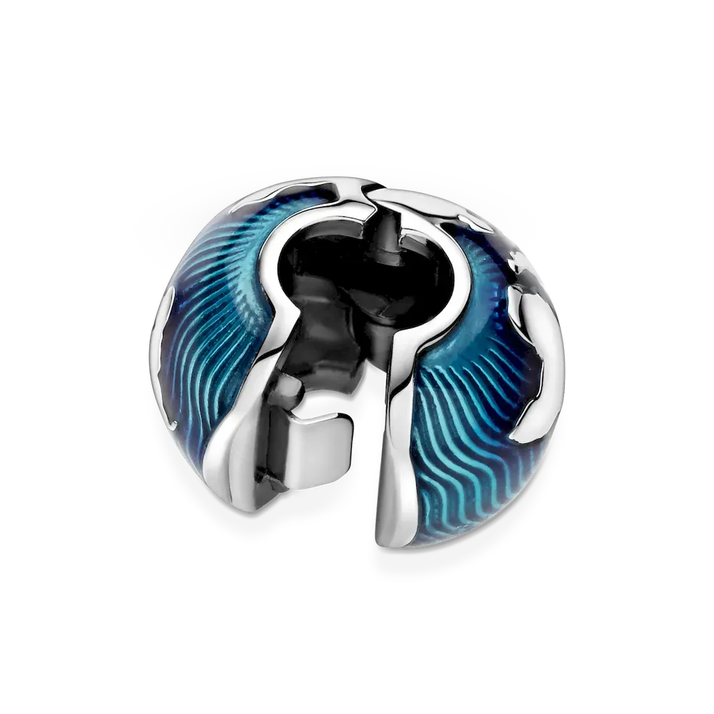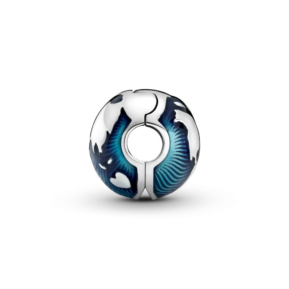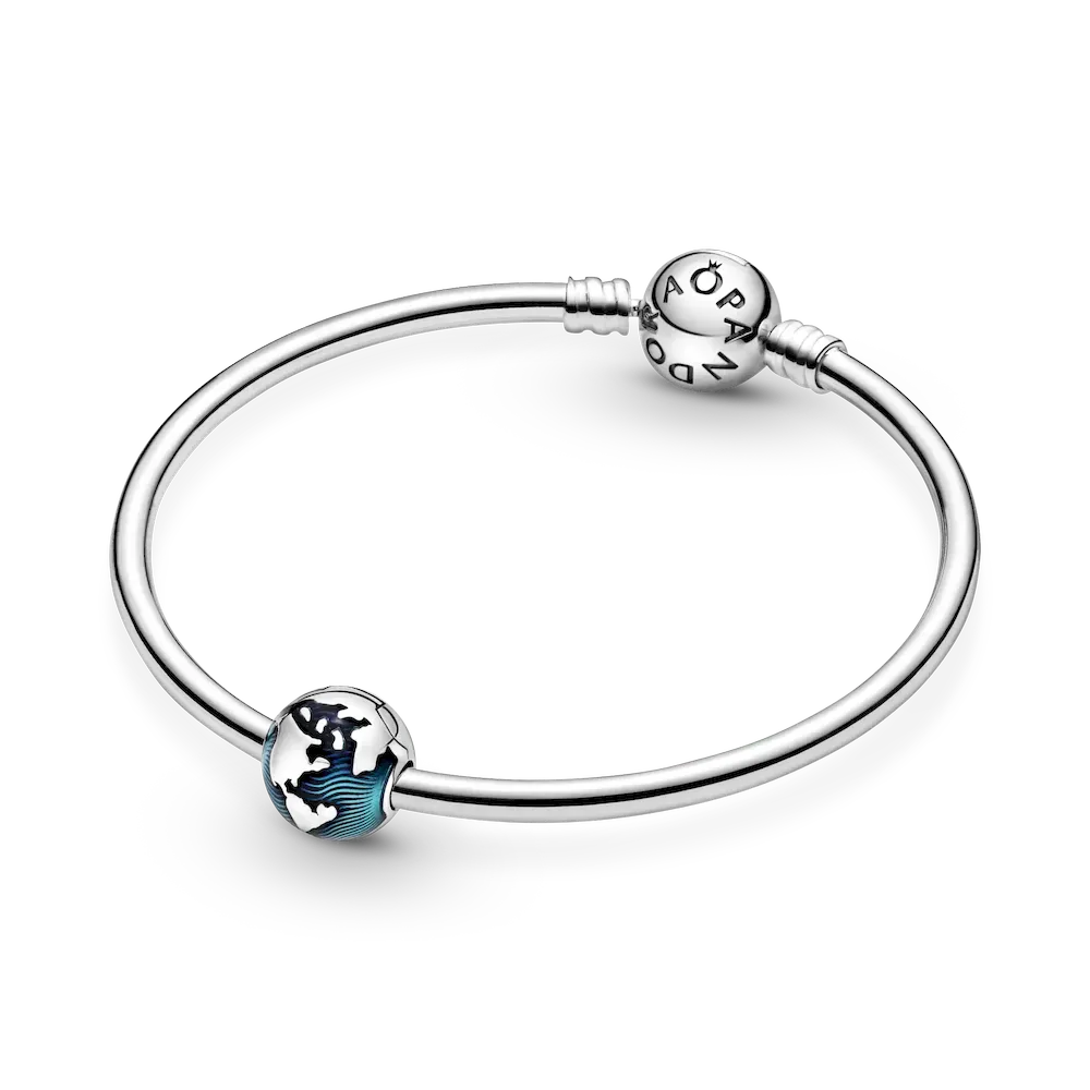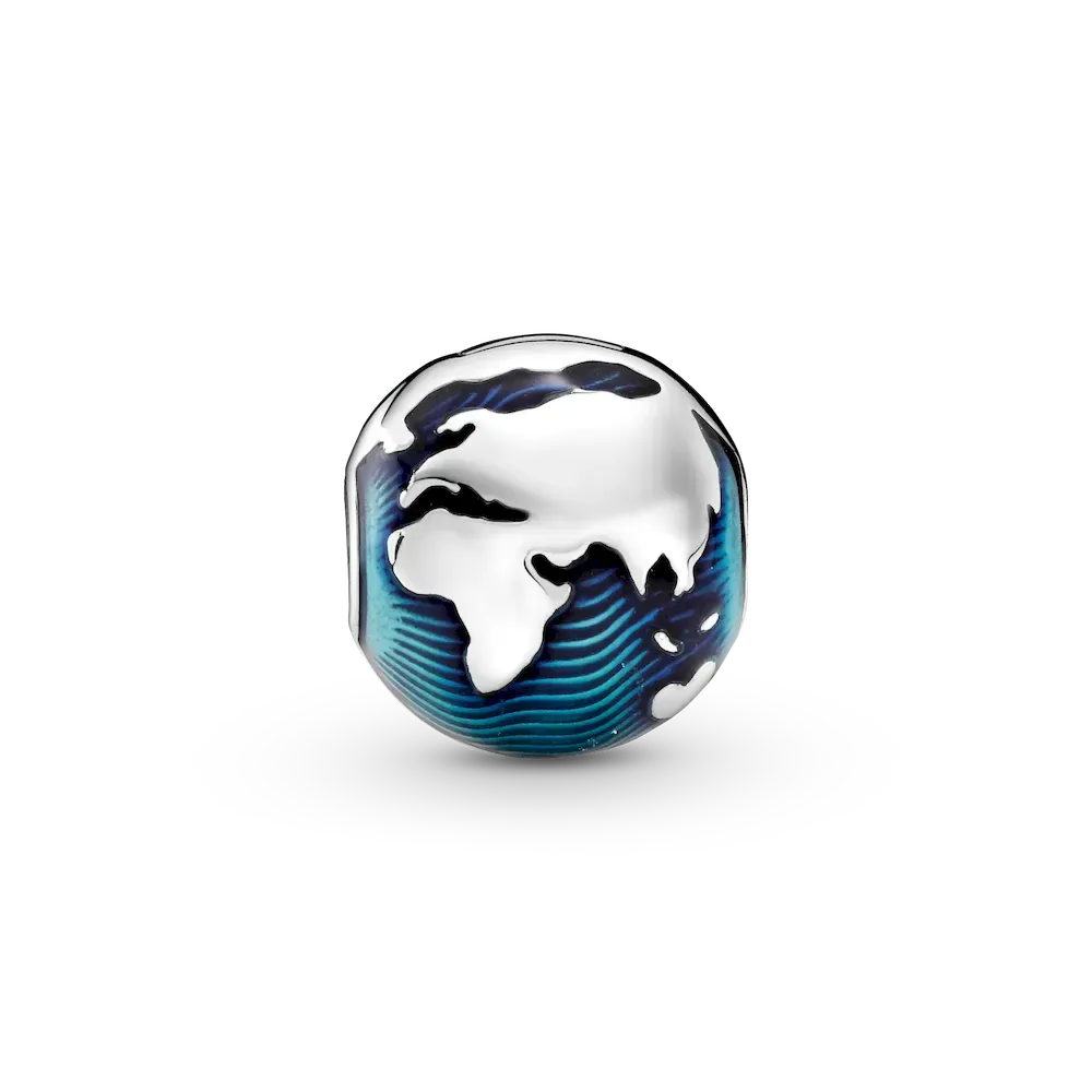 Express your love for our world with the Blue Globe Clip Charm. Polished sterling silver continents are surrounded by hand-applied blue enamel waves and Australia is shaped as a heart. Wear it as a reminder of future and past travels and pair it with other blue Pandora Moments charms as a tribute to our blue planet. This clip charm features no silicone grip, so it will slide if not styled onto threads (two raised charm dividers).