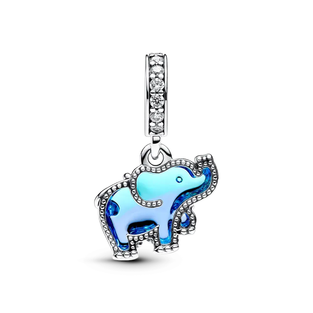 The Blue Murano Glass Elephant Dangle Charm is a colorful ode to a majestic creature. Sterling silver forms an elephant-shaped silhouette around a gradient blue-and-purple Murano glass with a raised ear and a concave rounded eye. Realistic elephant details include an uplifted trunk, feet and a swirling line forming a tail. The bail features a row of pavé and the engraved word