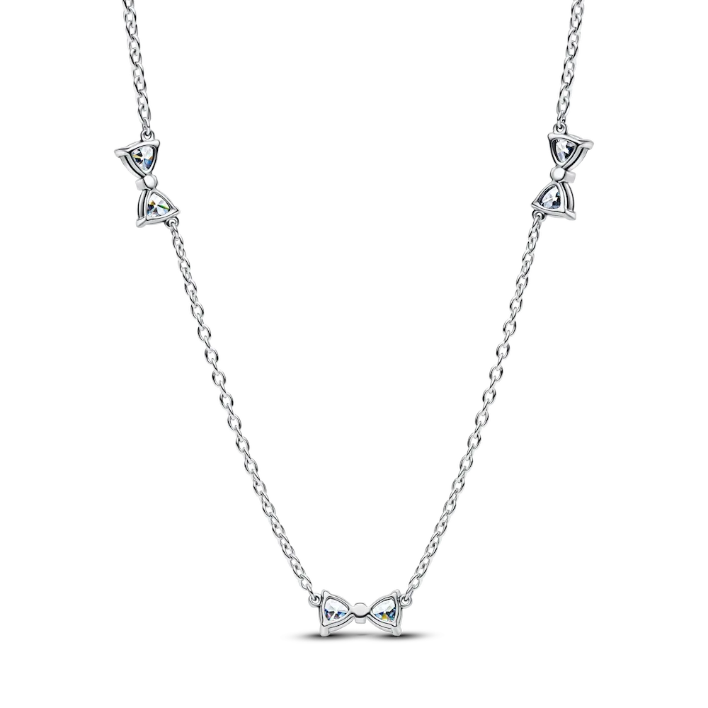 Some ties never come undone. Crafted in sterling silver, this necklace features bows fixed along its chain. Detailed with sparkling cubic zirconia, they symbolize strength and beauty.