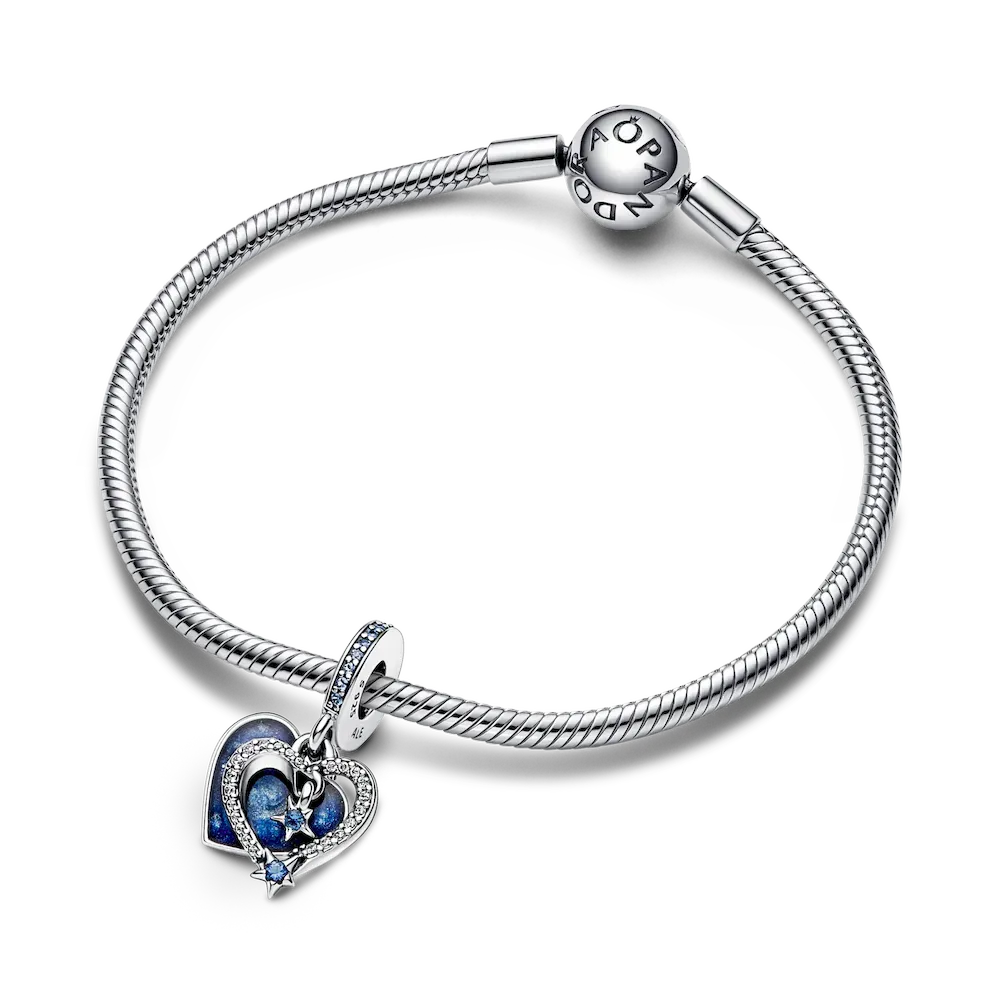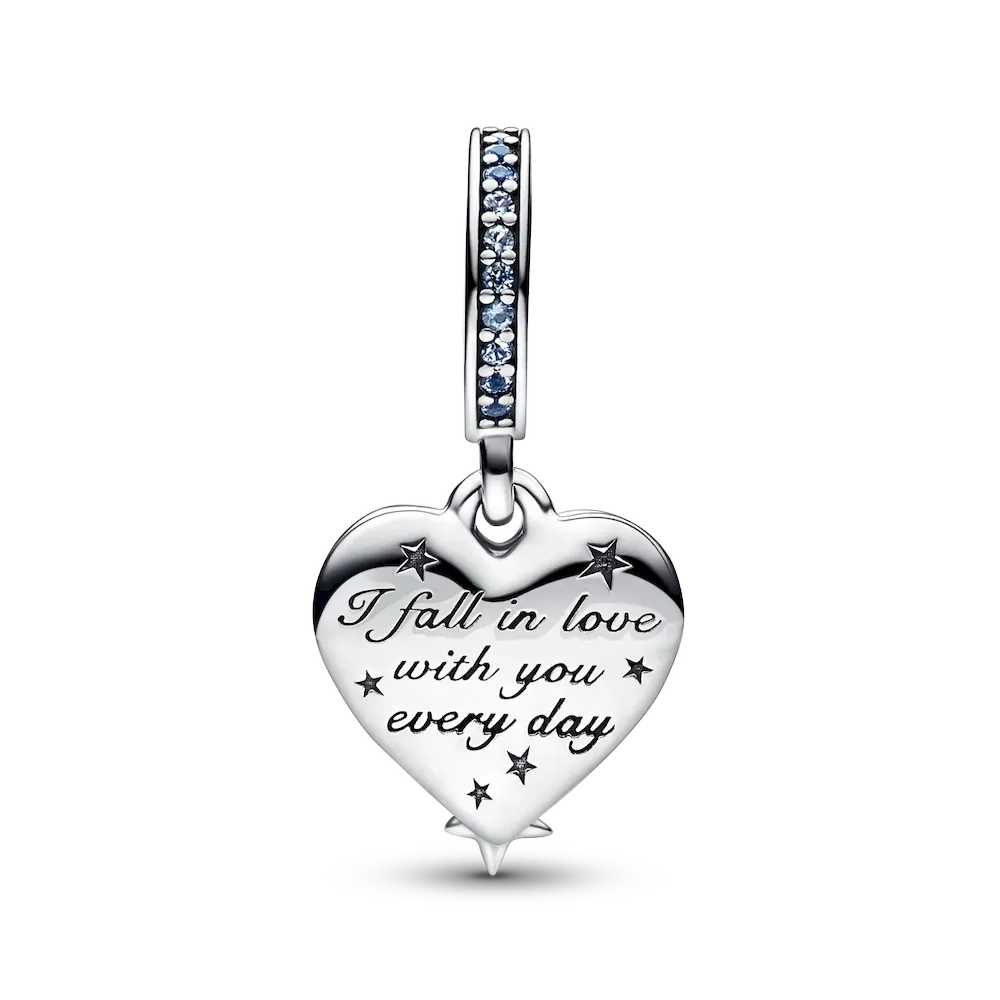 Two shooting stars come together to create a heart-shaped outline in this playful and romantic double dangle charm, crafted in sterling silver. Each star is set with a blue man-made crystal and the star trails feature clear cubic zirconia pavé. Behind the stars, a swirling galaxy effect shows through from the back part of the dangle, created with shimmering enamel in different shades of blue. The back of the enamelled part is engraved with the message