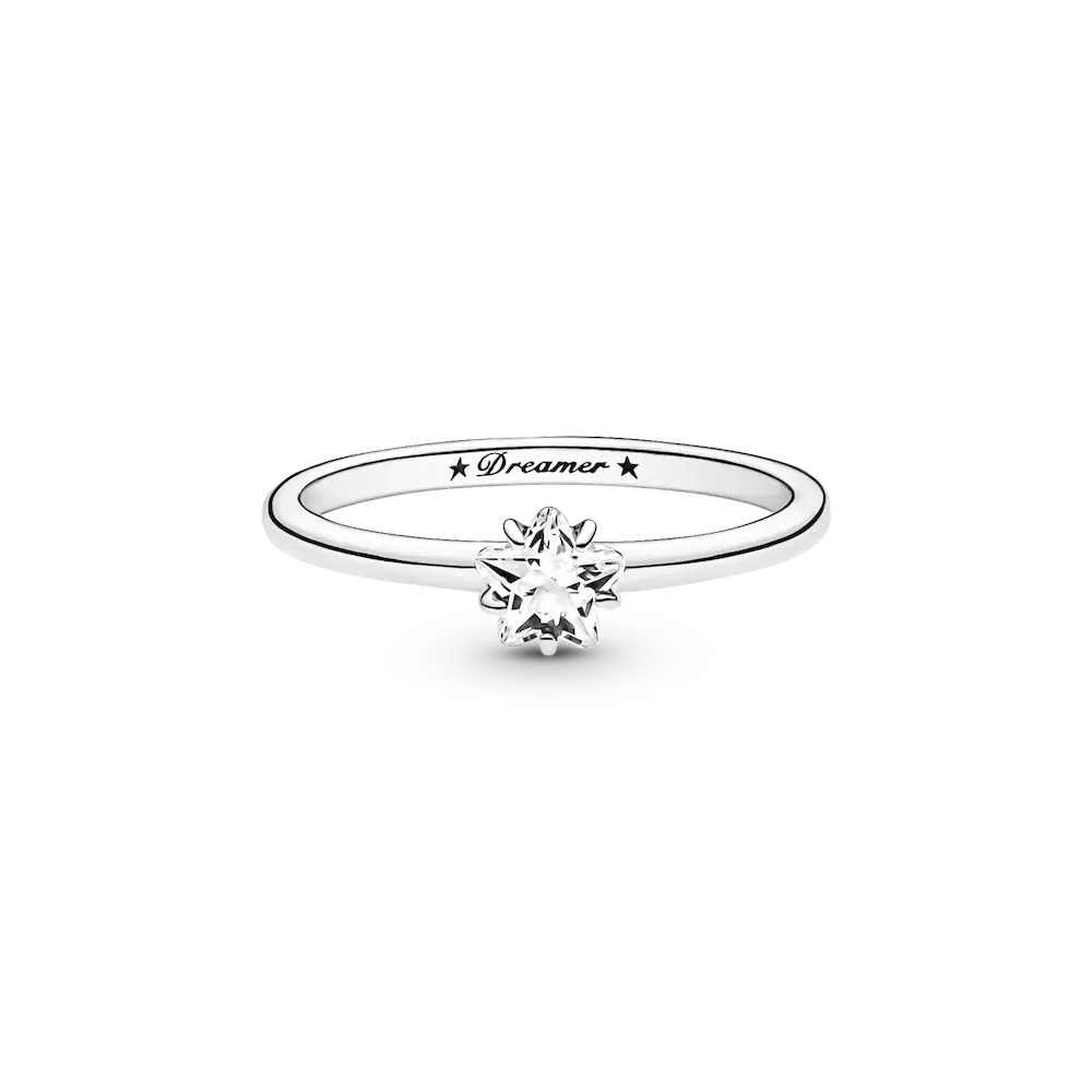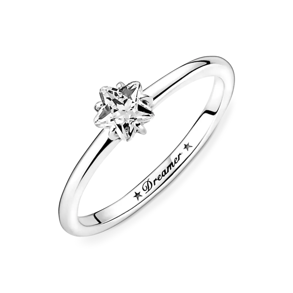 Bring starry sparkle to your outfits with the Celestial Sparkling Star Solitaire Ring. Inspired by celestial beauty, the sleek sterling silver ring features a center star-shaped clear cubic zirconia stone and is complemented by two asymmetric stars and the word