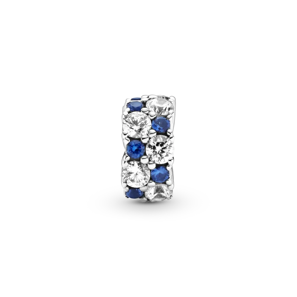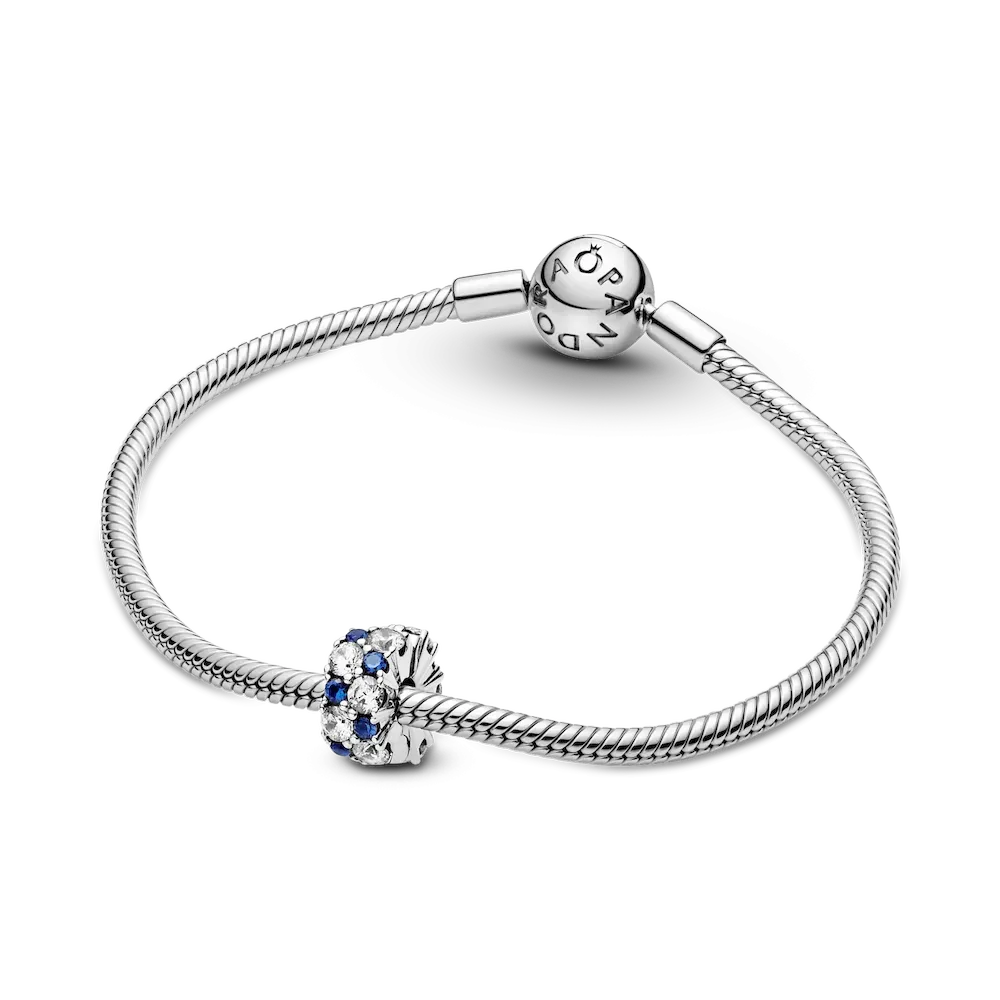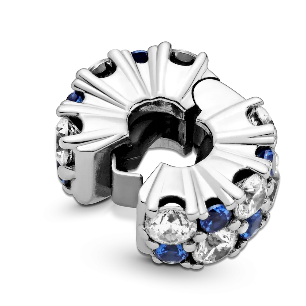 Add extra sparkle to any outfit with the Clear & Blue Sparkling Clip Charm. Hand-finished in sterling silver, this decorative piece is inspired by key design elements from the Pandora Timeless collection. The round clip features clear and stellar blue stones in various sizes along its outer edge. Attach the clip to your Pandora Moments bracelet to separate your favorite charms and bring subtle color and shimmer to your style. This spacer charm features a silicone grip, does not fit onto threads (two raised charm dividers.) This charm can be styled anywhere else on the bracelet.