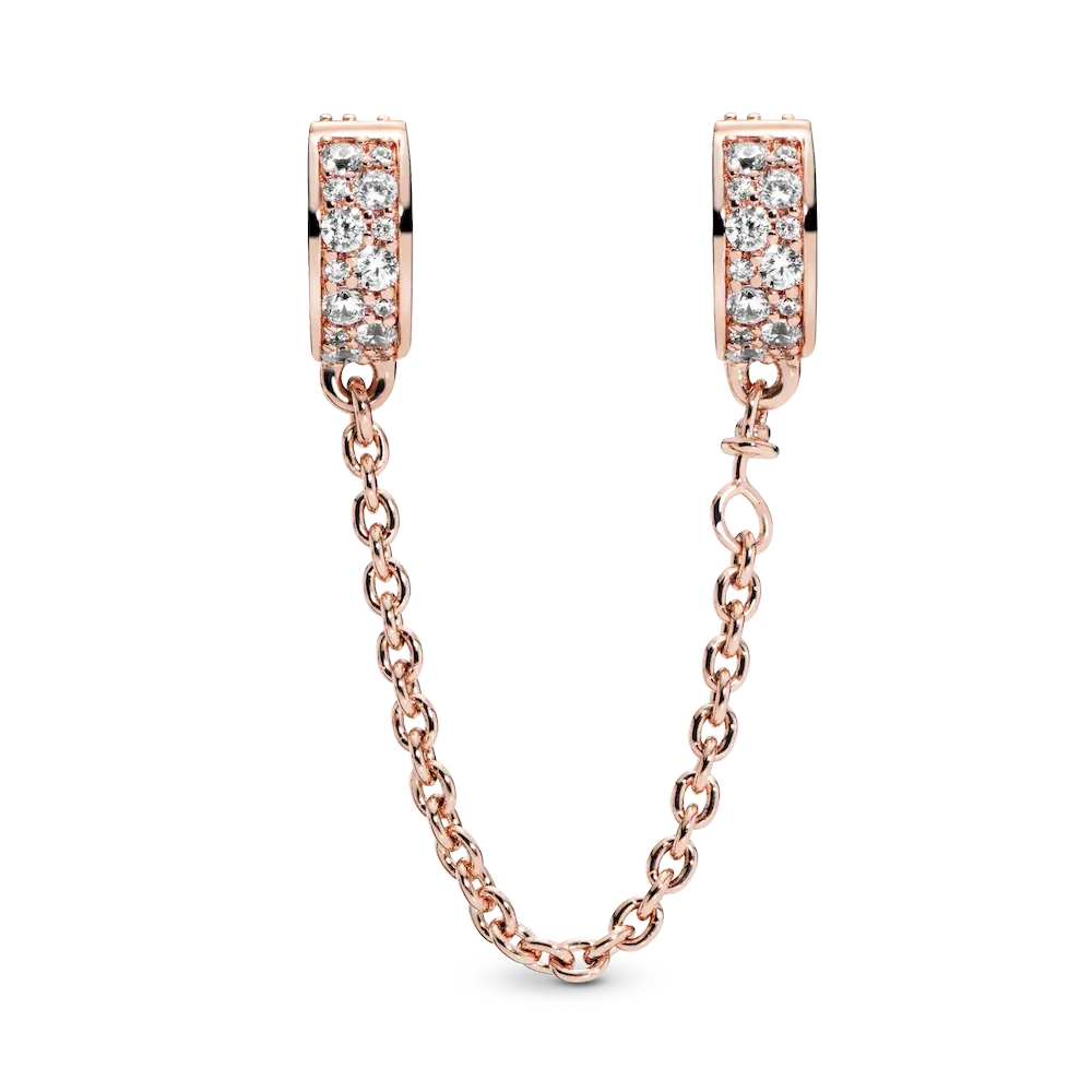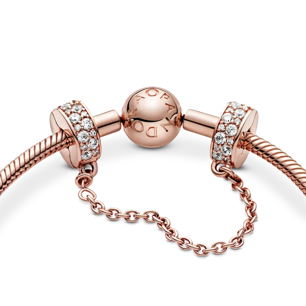 Keep your precious memories stylishly safe on your Pandora Moments bracelet with our Clear PavĂ© Safety Chain Clip Charm. The finishing touch to a personal styling, the practical yet purposeful 14k rose gold-plated piece is set with cubic zirconia stones for a sparkling finish. Swivel ends on the chain ensure it won’t tangle and hidden silicone grips ensure perfect positioning on your chosen carrier.