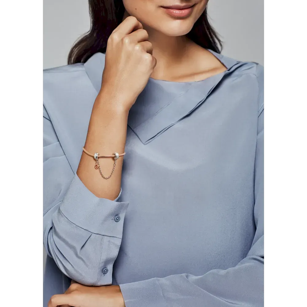 The Pandora Moments bracelet safety chain features a dangling crown O detail and a delicate chain that ensures charms stay nicely in their place. The chain gives the bracelet a sense of movement, and the two-tone design adds style. We know your charms are precious, so for an added a layer of security, the charm features inner silicone grips to stop your treasures from falling off.