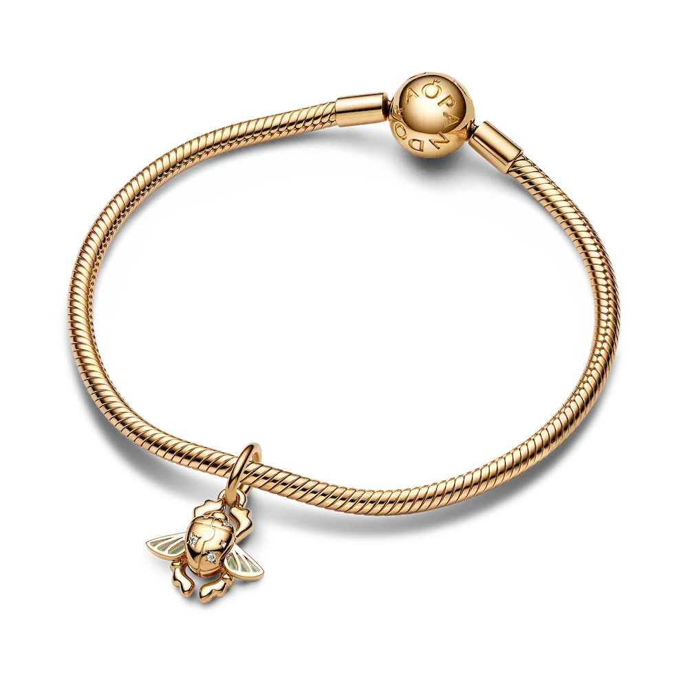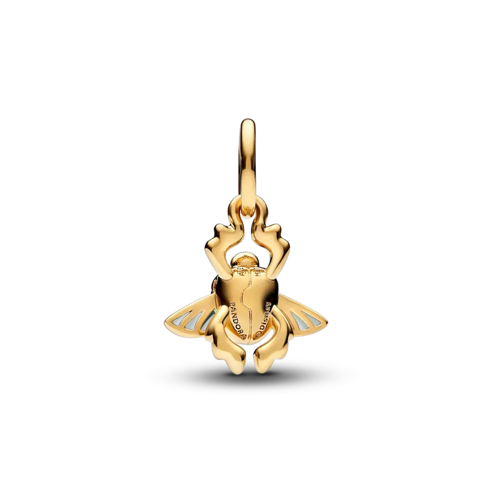 Celebrate the 30th anniversary of Disney’s Aladdin with Disney x Pandora. This 14k gold-plated charm is inspired by the golden Scarab Beetle, the key to the Cave of Wonders and its dangerous treasures, where Aladdin famously meets Carpet and finds Genie’s lamp. Set with round brilliant-cut cubic zirconia, the dangle charm is finished with plique-a-jour enamel wings that really move up and down, for an enchanting effect. Style this symbolic Disney Aladdin Scarab Beetle Dangle Charm on your favorite charm holder and face the world with your favorite stories by your side.