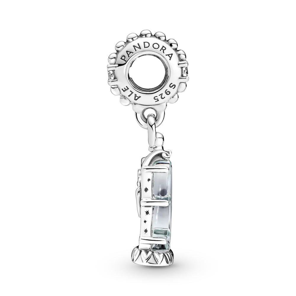 Add a magical touch to your style with the Disney Beauty and the Beast Enchanted Rose Dangle Charm. It features a transparent light blue Murano glass dome with engraved stars encasing a cut-out rose with red and green hand-applied enamel details. Hand-finished in sterling silver, the charm is decorated with clear cubic zirconia stones and micro-beads on the bail and features the engraving