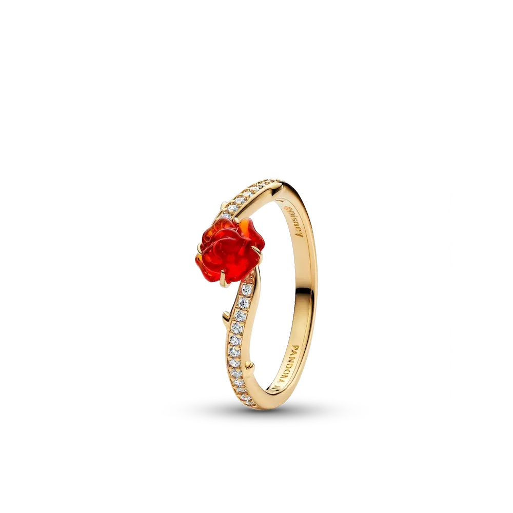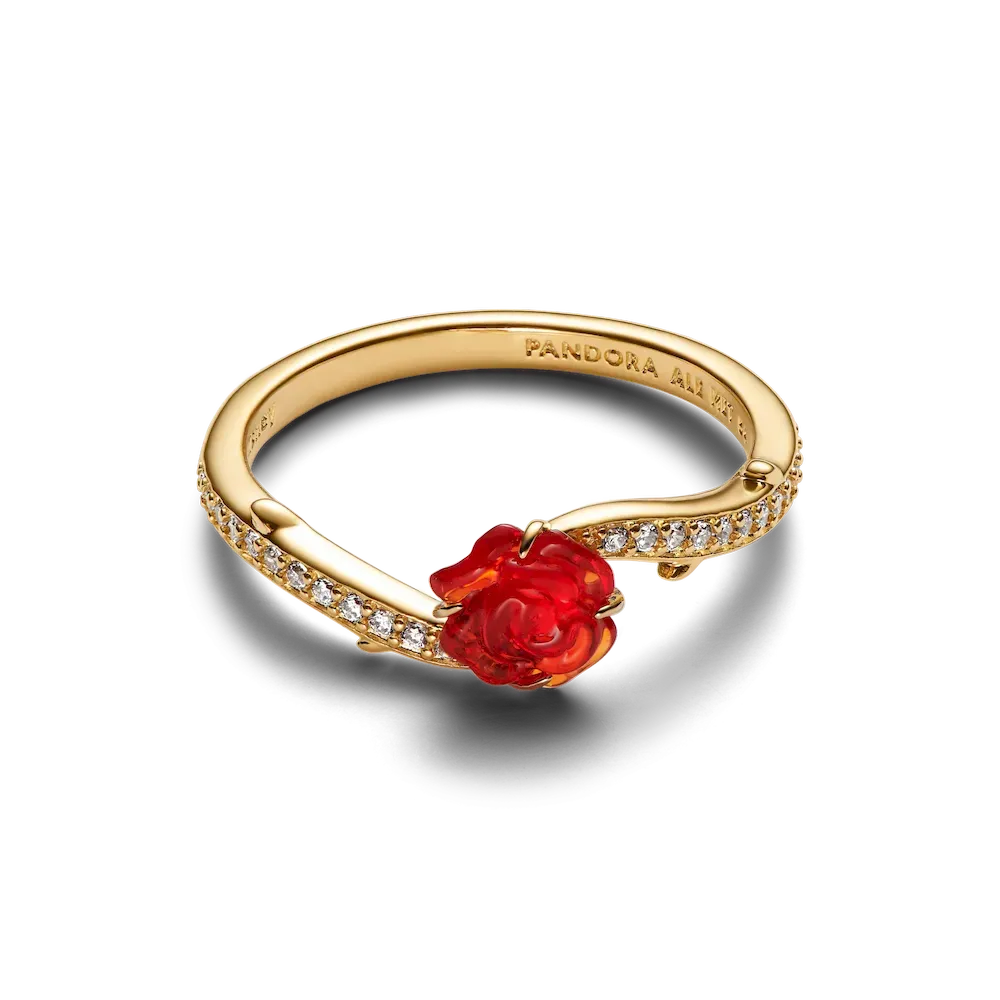 Add an enchanting touch to your look with our Disney’s Beauty and the Beast ring. Crafted in 14k gold plating, it features a Murano glass rose with sparkling stones and thorn details along the band.