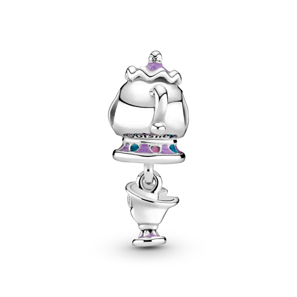 Be our guest and help yourself to this Disney Beauty and the Beast Mrs. Potts and Chip Dangle Charm. Featuring two of the most unforgettable characters from Disney’s Beauty and the Beast, this sterling silver Mrs. Potts-shaped charm features an adorable little Chip swinging from the base. Both characters are brought to life with lilac, blue and pink hand-applied enamel details. The sweet charm will add heartwarming cheer to every look.