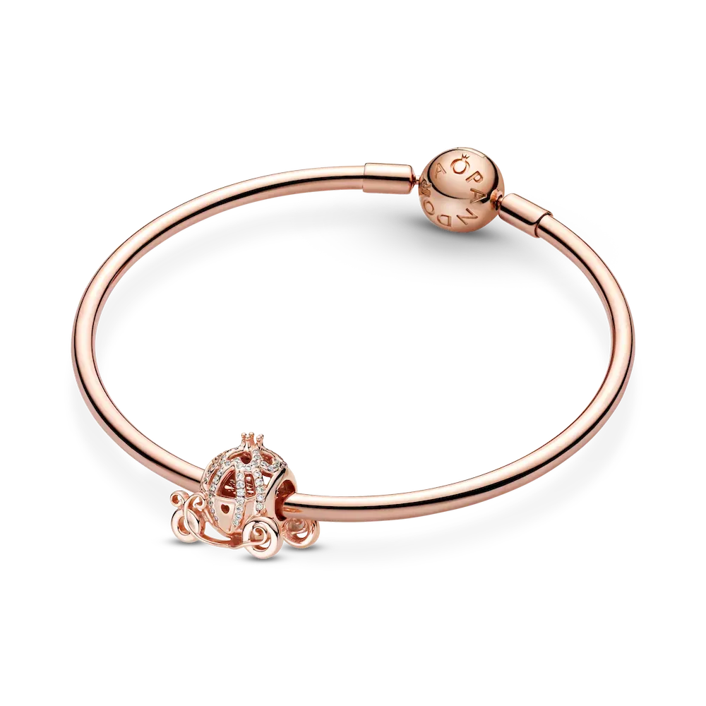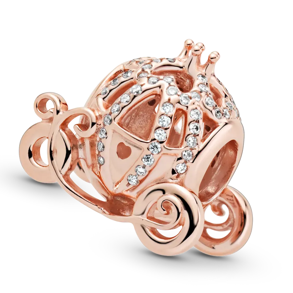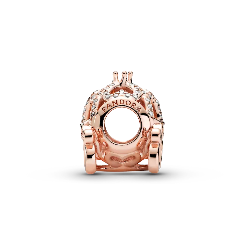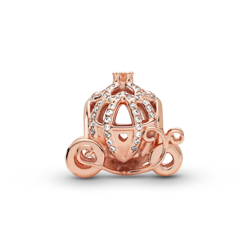 Show up to the ball in style with the Disney Cinderella Sparkling Carriage Charm. Designed to celebrate the 70th anniversary of Disney’s Cinderella, this piece is hand-finished in 14k rose gold plating. Shaped like her pumpkin carriage, this openwork charm is decorated with clear stones and features a 3D crown on its roof and ornamental wheels. Style this charm on your Pandora Moments bracelet with shimmering pieces in sterling silver for a magical mixed metal look.
