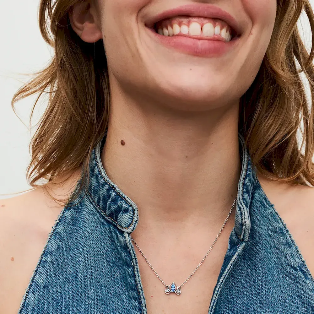 Follow the call of the ball with the Disney Cinderella’s Carriage Collier Necklace from Disney x Pandora. This sterling silver necklace features an intricate pendant inspired by Cinderella’s enchanted pumpkin carriage, with a blue marquise-shaped stone surrounded by swirling openwork details. Small cubic zirconia stones sparkle on the wheels and pumpkin stem. The pendant is fixed to the chain, and the necklace is adjustable to three lengths. Style it together with the matching stud earrings for an elevated Cinderella-inspired look.
