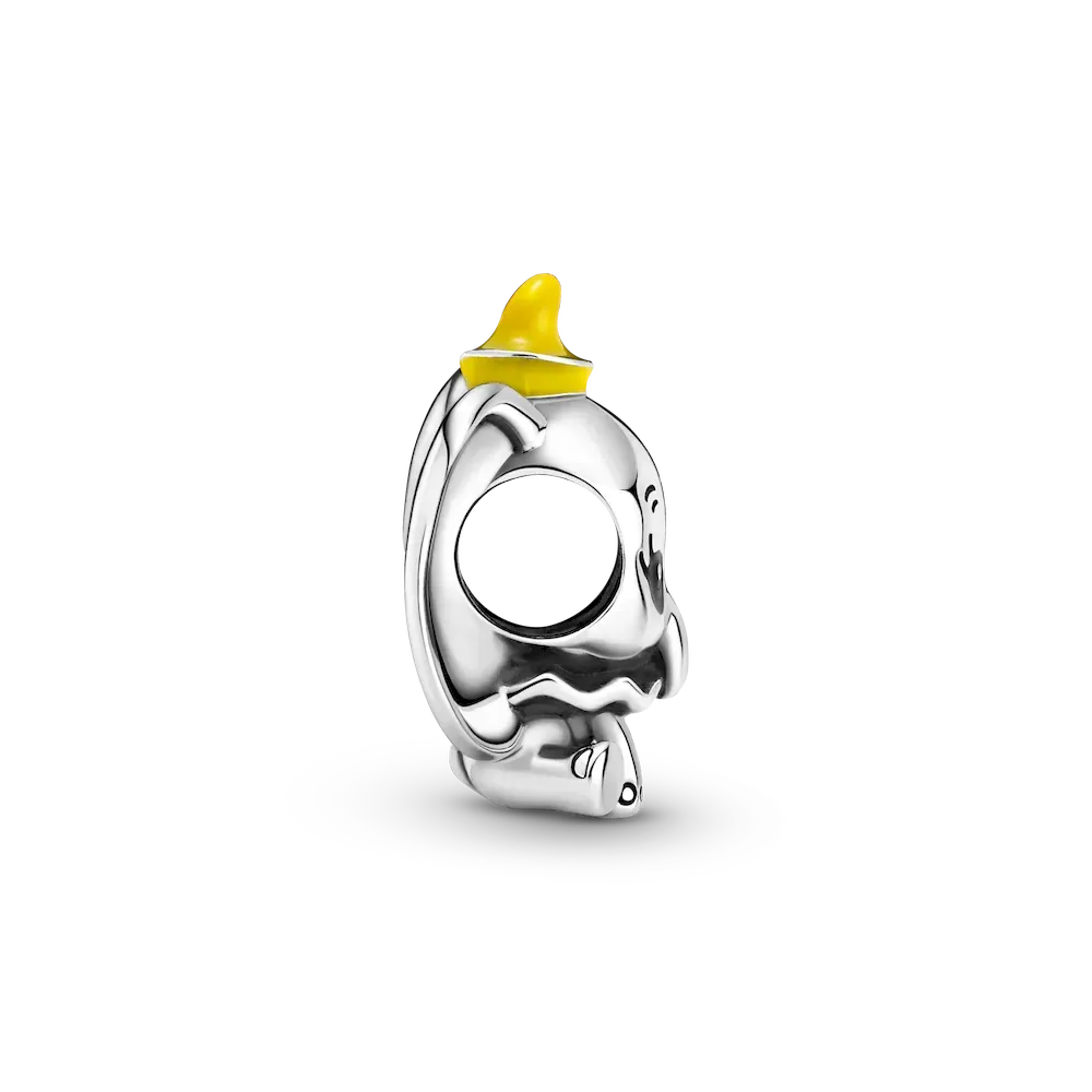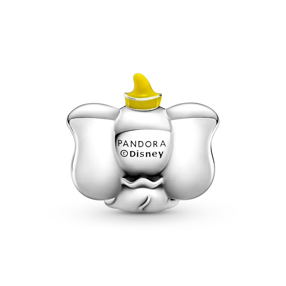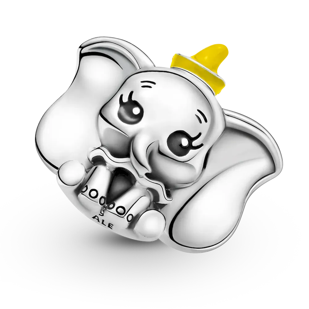 Fly high with the Disney Dumbo Charm. Hand-finished in sterling silver, this charm was designed in collaboration with Disney’s toy designers. Disney’s Dumbo features an enlarged head and smaller body for an adorable finish. The character has big polished ears, engraved toes and black hand-applied enamel eyes. Dumbo’s wearing a ruffled collar and his iconic hat covered in hand-applied yellow enamel with sterling silver detailing. Wear this magical design alongside other Disney x Pandora styles for a fun-filled look.