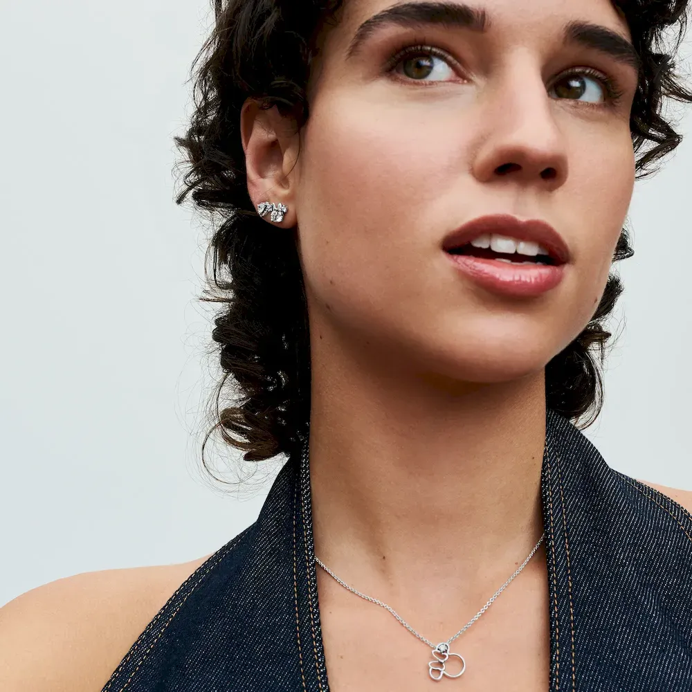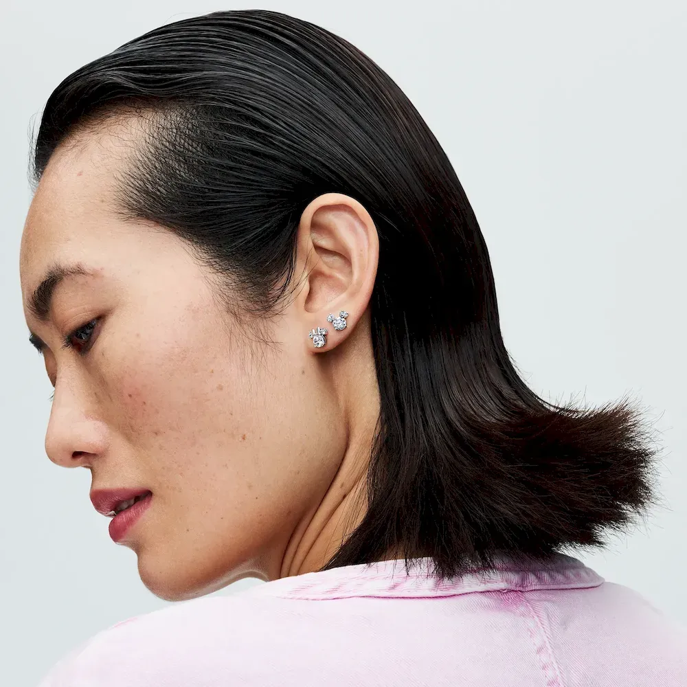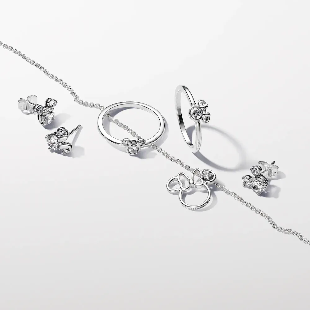 Step into the magical world of Disney with our sterling silver Mickey Mouse & Minnie Mouse Sparkling Stud Earrings. The iconic silhouettes come to life with prong-set oval and round brilliant-cut cubic zirconia, creating a dazzling tribute to these beloved characters. The intricate detailing, from Mickey’s oval ears to Minnie’s bow, captures the essence of Disney magic. Engraved with Pandora and ©Disney logos, these earrings are not just accessories; they’re a wearable celebration of the enchanting love story between Mickey and Minnie.