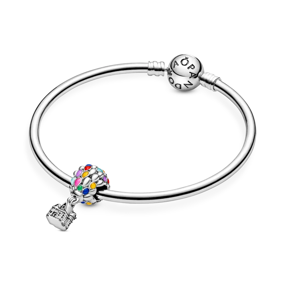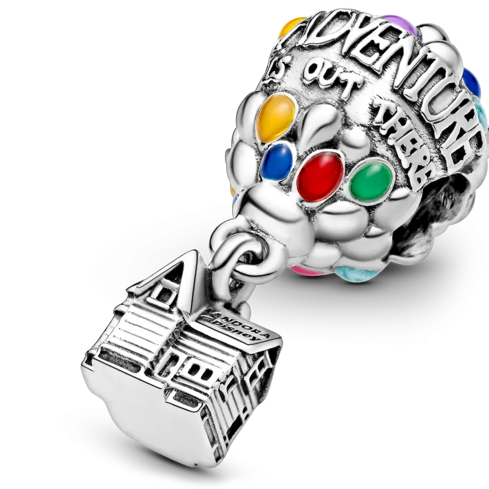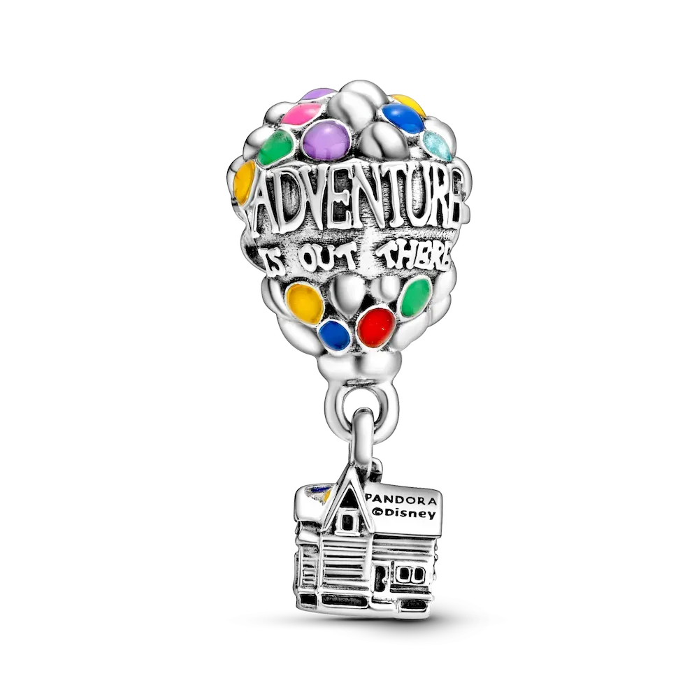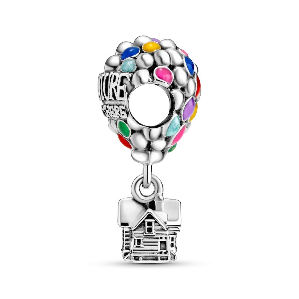Get ready to go on a journey of a lifetime with Disney’s Up House & Balloons Charm. The colorful charm features a bundle of hand-applied enamel princess blue, light blue, mandarin orange, pale cerise, vibrant green, purple and magenta balloons carrying the sterling silver dangle house that Carl uses to go on his fantastic journey. Raised letters amongst the many colorful balloons add an inspirational touch with the statement “Adventure is out there”.