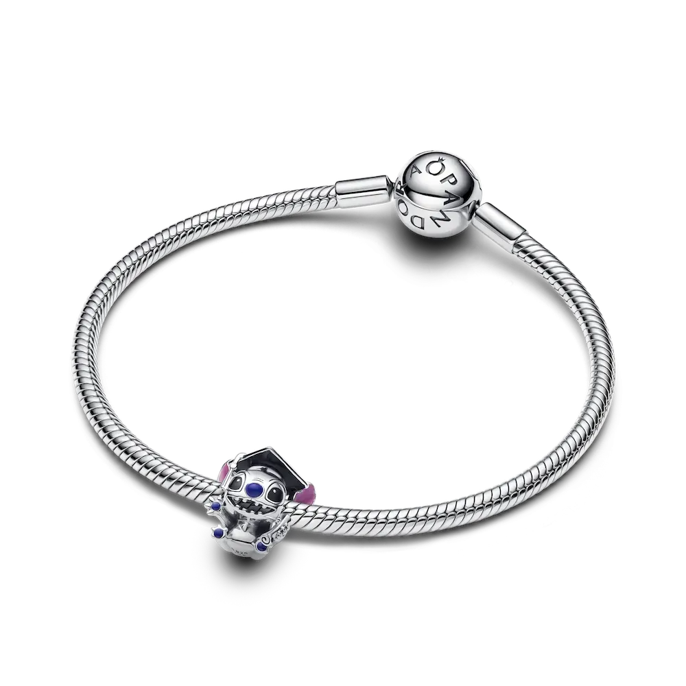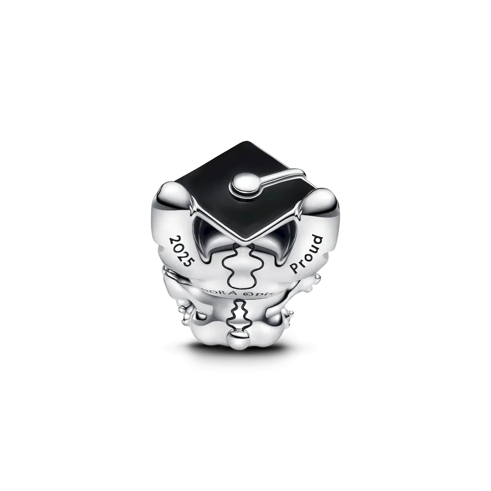 Celebrate proud graduates with the Disney Stitch Graduation Charm. Made of sterling silver with colorful enamel details, this charm is shaped like Disney’s mischievous and endearing Stitch character, dressed up with a graduation cap and scroll. Complete with two engravings –