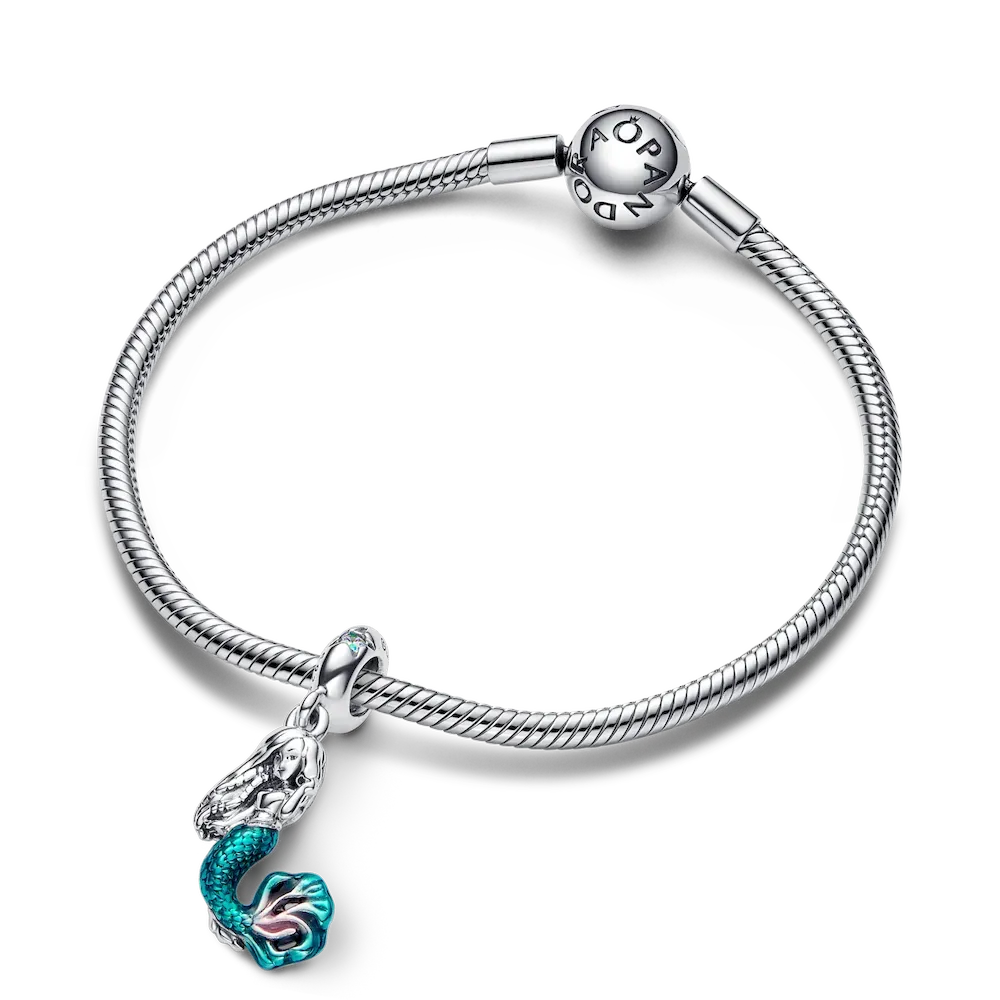 Journey beyond the sea with our Disney The Little Mermaid Ariel Dangle Charm, inspired by the new live-action film adaptation. Celebrate your free spirit and curious heart by adding this sterling silver charm to your collection. Ariel’s face and locs are brought to life with engraved details, and her mermaid tail shines with hand-applied teal and cerise enamel. A sparkling aurora borealis clear cubic zirconia rests atop the bail, like the sun reflecting on the ocean waves. Keep Ariel by your side as a reminder to follow your heart where adventure leads.