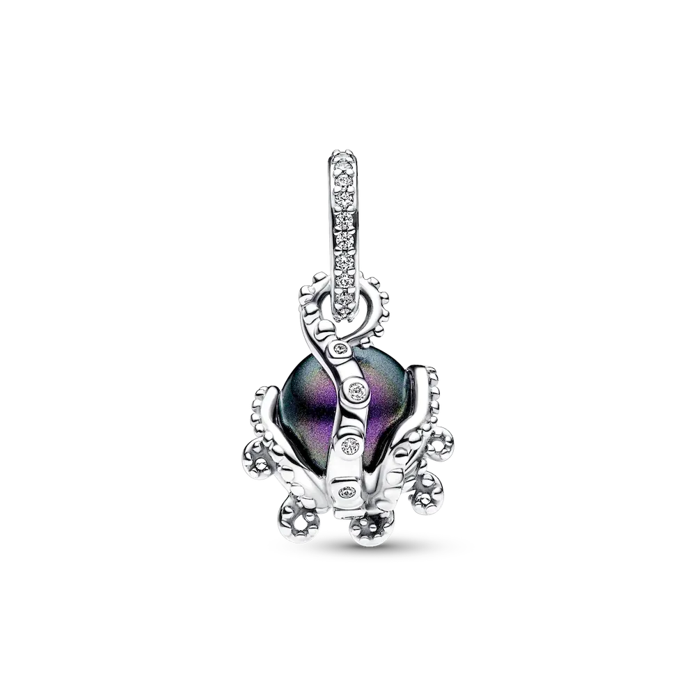 Channel the deepest corners of the ocean with our Disney The Little Mermaid Ursula Dangle Charm. Inspired by the mysterious power of Ursula, this charm captivates with a luminous purple lacquered artificial pearl encased in sterling silver tentacles. Sparkling stones on the tentacles and a pavé-covered bail catch the light like the sun reflecting off the waves.