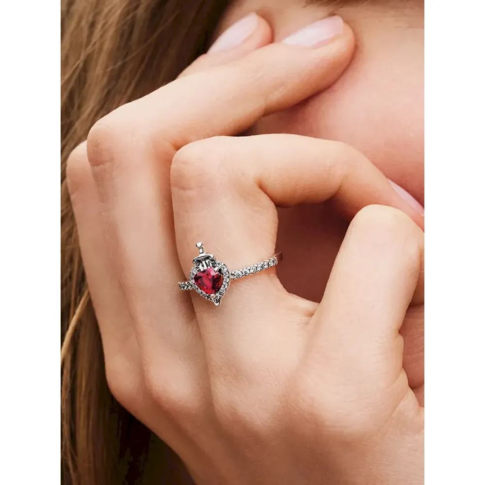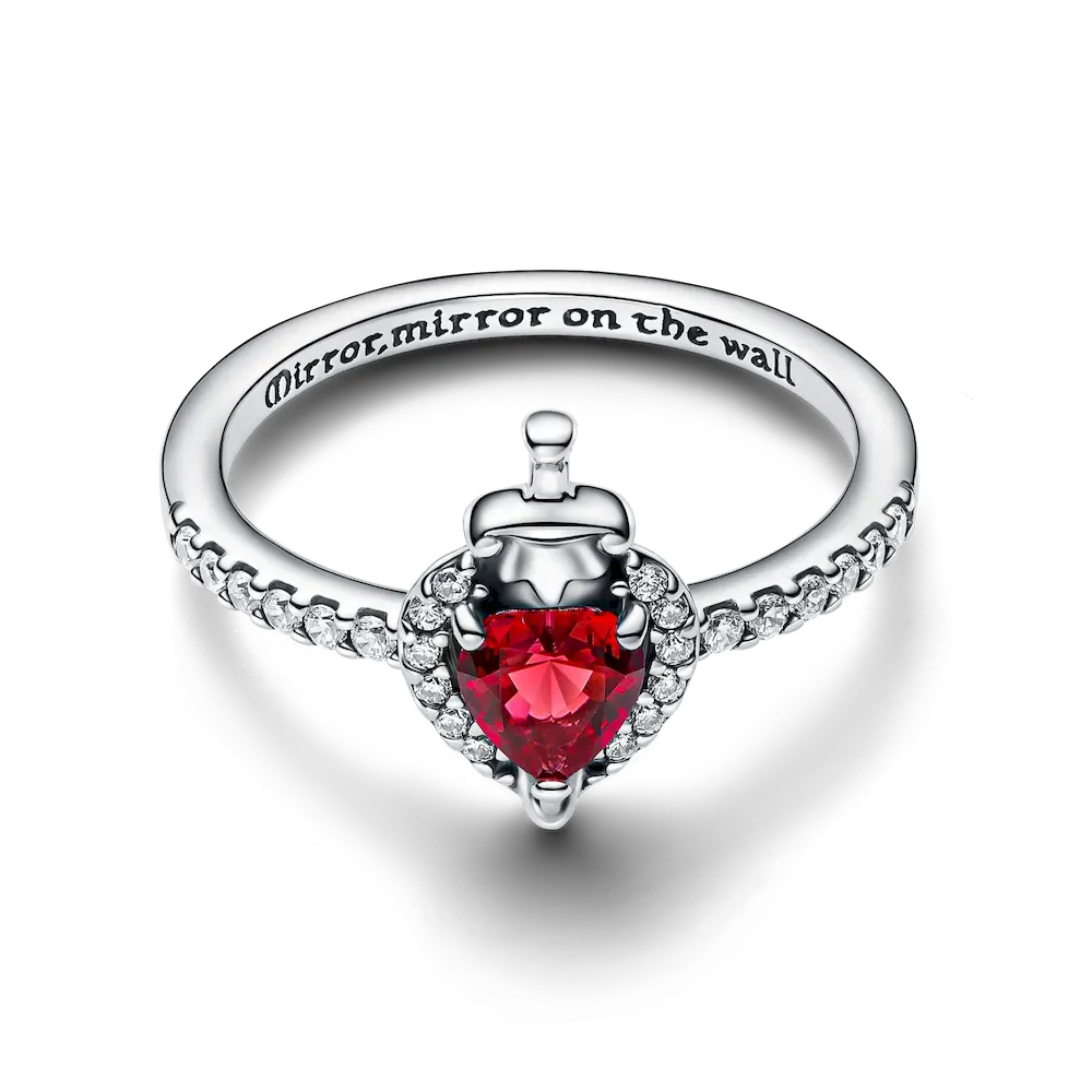Mirror, mirror on the wall, which is the fairest ring of all? Channel the Evil Queen from Disney’s Snow White with this heart shaped ring that has been pierced with a dagger. Set with a heart-shaped fuchsia rose man-made crystal, the ring is inspired by the shape of the iconic box that belonged to the Evil Queen. Crafted in sterling silver, make a wicked fierce statement with this symbolic piece.
