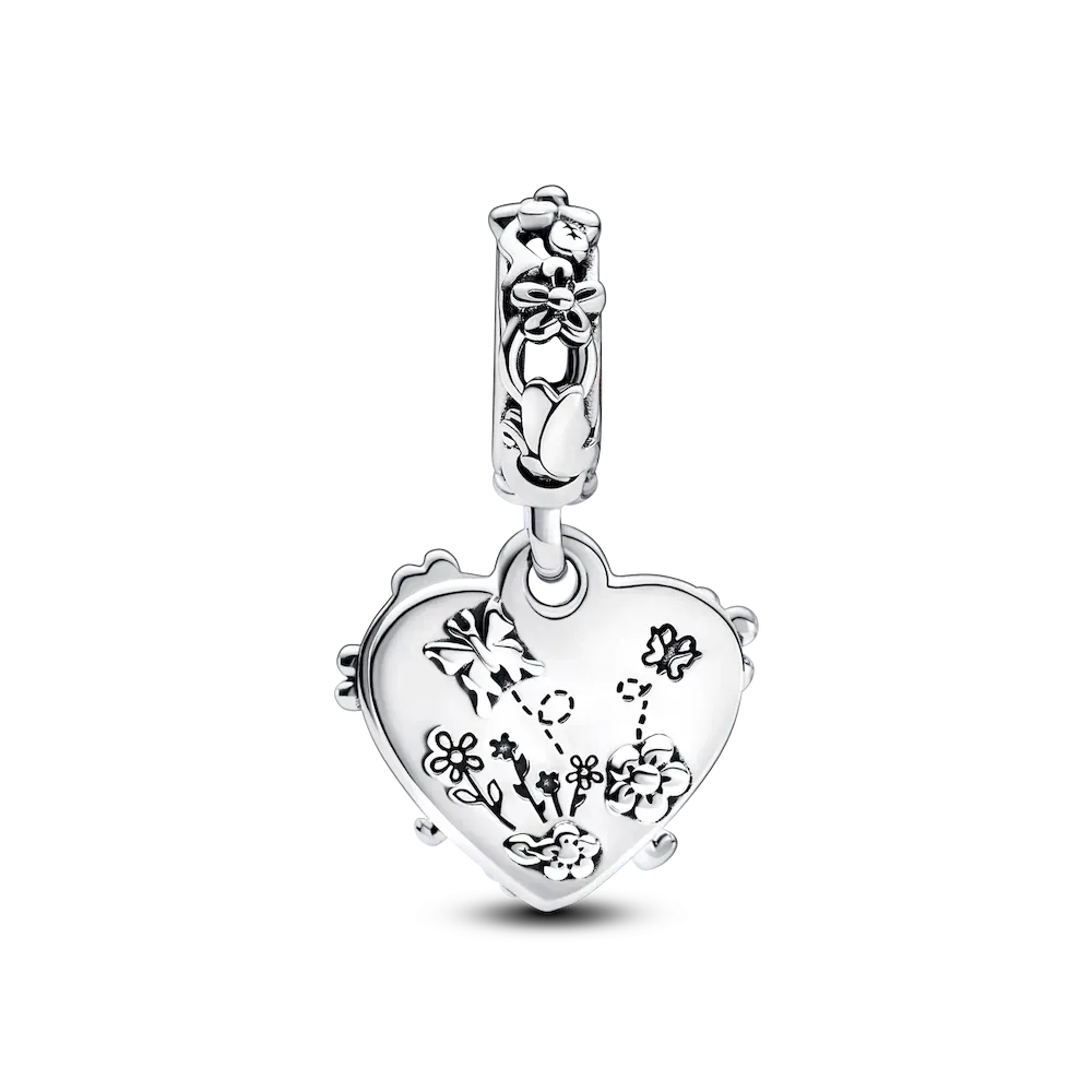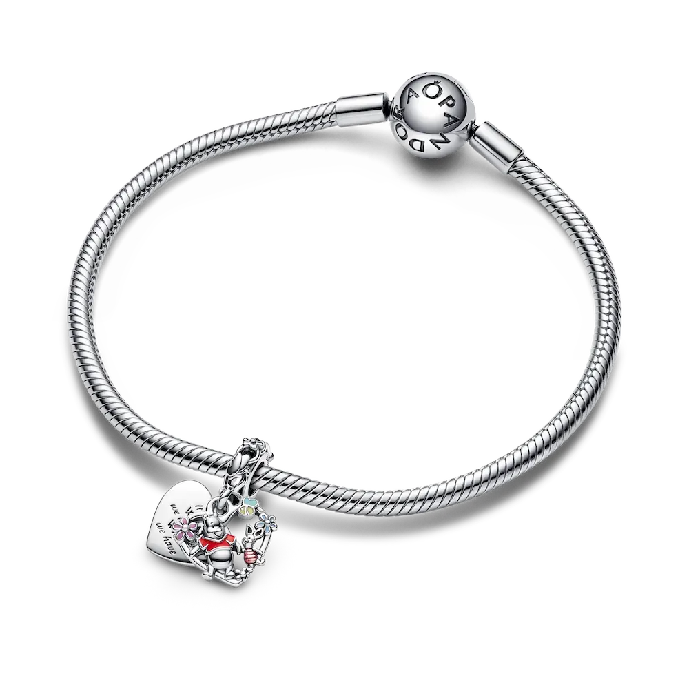 Life is better with friends by your side. Reignite your favorite memories with the sterling silver Disney’s Winnie the Pooh & Piglet Double Dangle Charm featuring the best friends from the Hundred Acre Wood. The two friends walk hand-in-hand through an idyllic landscape with openwork enamel-detailed bees and flowers in a heart-shaped frame. Another heart-shaped disc forms the background and is engraved with the message,