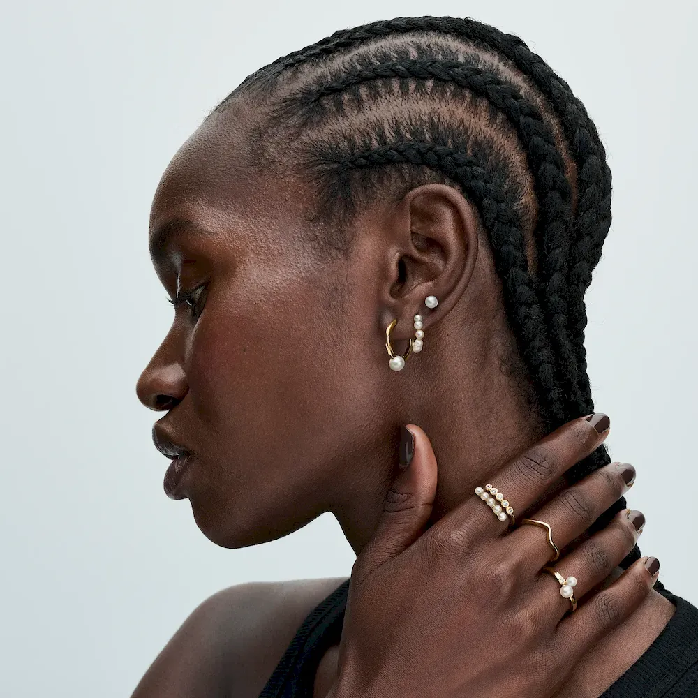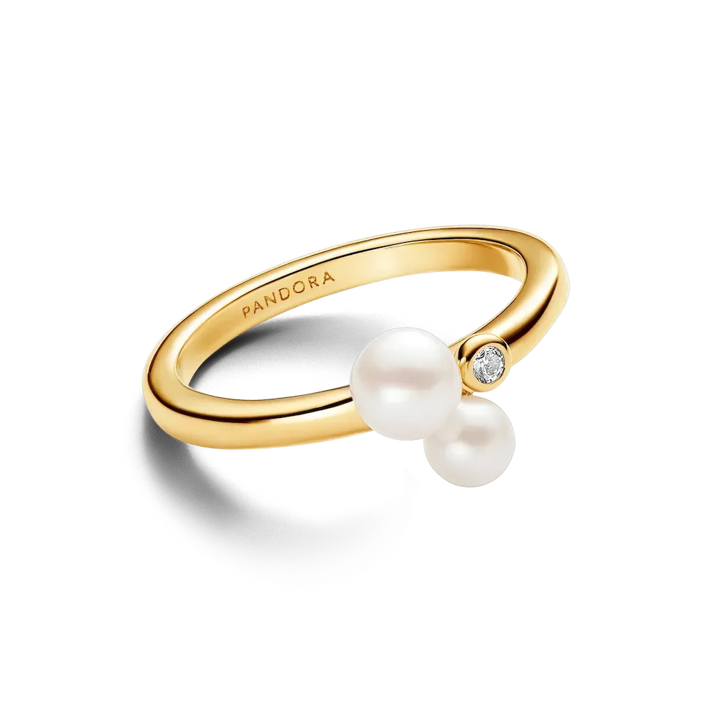 Celebrate togetherness our Duo Treated Freshwater Cultured Pearls Ring from the Pandora Timeless collection. Plated with 14k gold, the slightly squared profile of the band showcases two asymmetrically placed treated freshwater cultured pearls, accompanied by clear cubic zirconia. This unique piece, embellished with the engraved Pandora logo, captures the essence of classic pearls, symbolizing beauty, wisdom, and love. Wear it as a symbol of your unique connection. Please note each treated freshwater cultured pearl is unique and can vary in size and color; normal wear and tear may occur with this material. Our freshwater cultured pearls are treated with bleaching and luster enhancement.