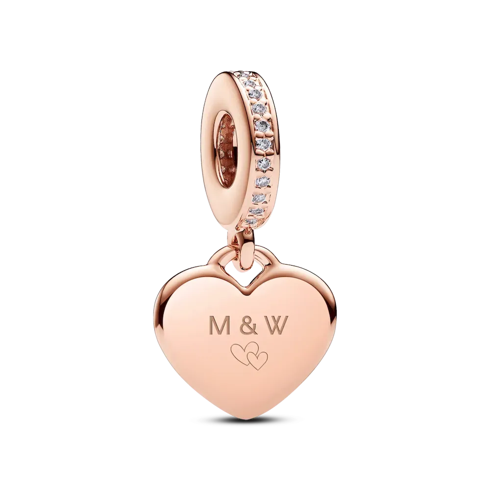 Spread the feeling of love with the Engravable Heart Tag Dangle Charm. Hand-finished in 14k rose gold plating, this polished heart-shaped dangle is engravable on the front and back and features sparkling clear stones on the bail. Customize this charm with a personal message as a token of self-love or give as a gift and add a heartfelt engraving to show someone close to you that you care.