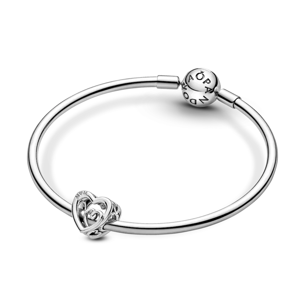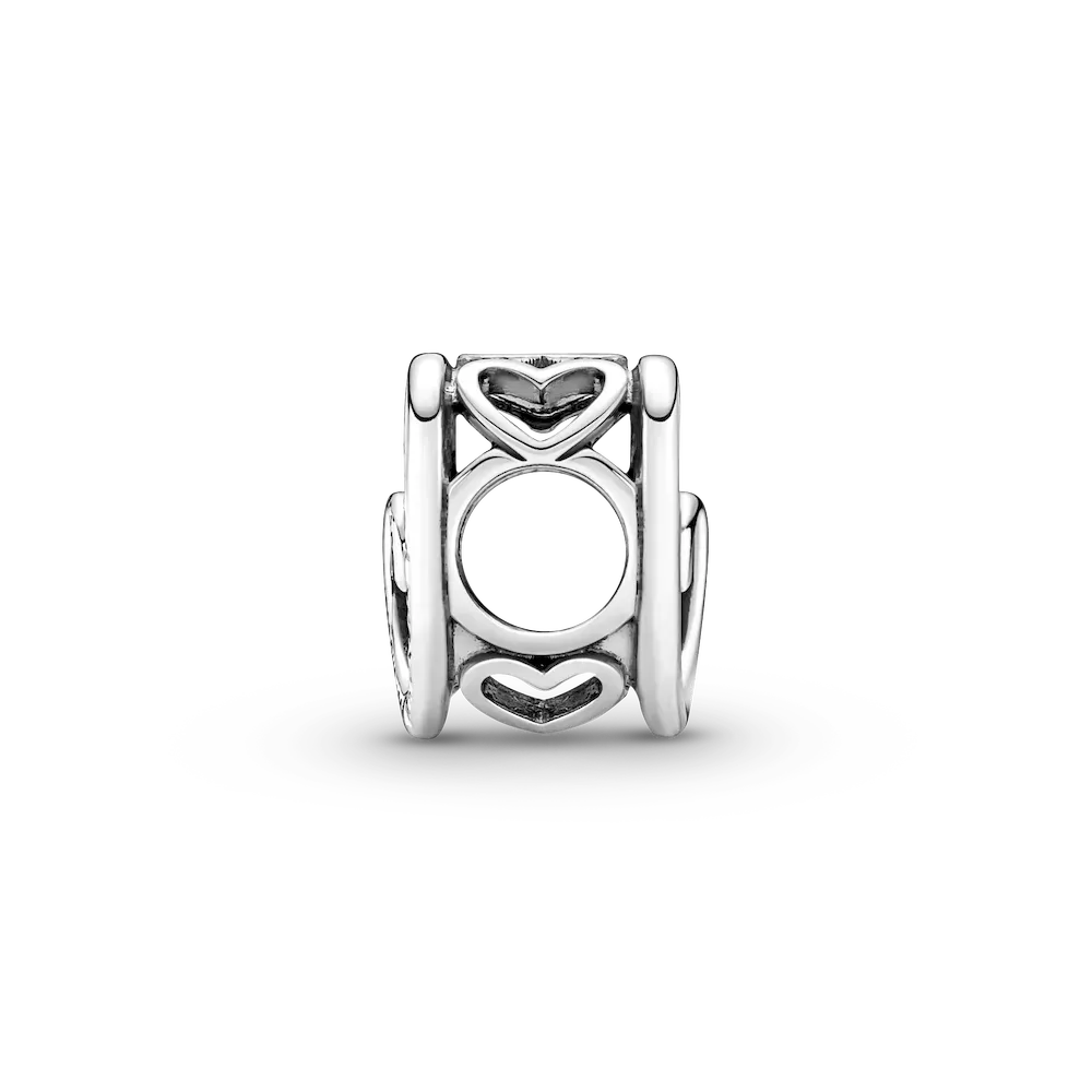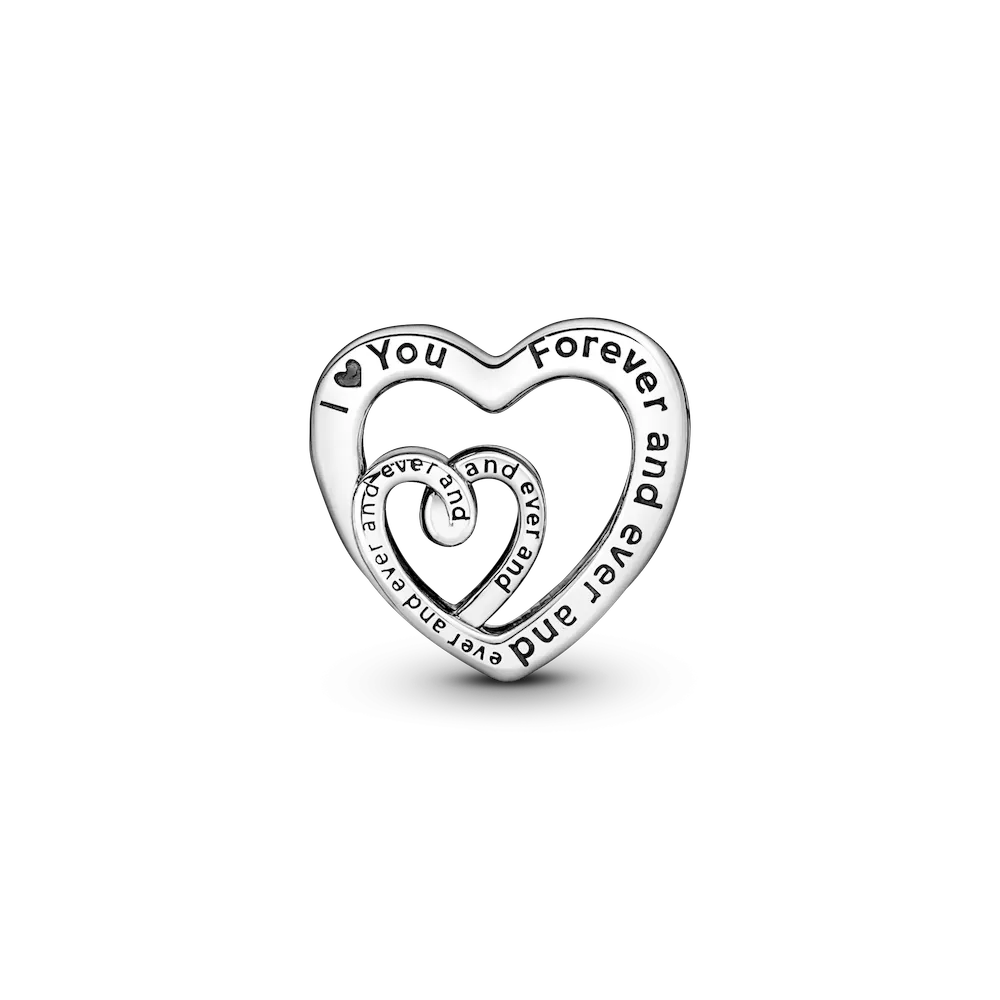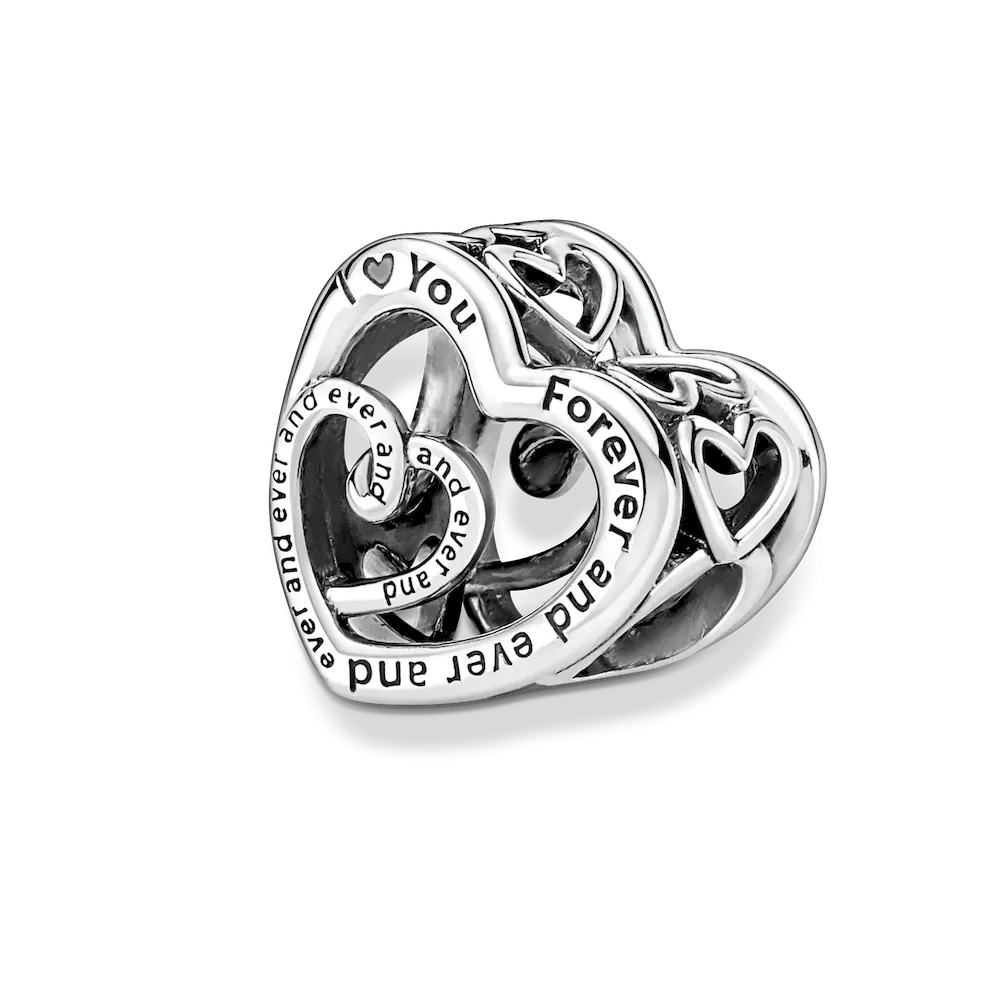 Love shines in the Entwined Infinite Hearts Charm. Crafted in sterling silver, it features one heart swirling into another with the engraving: