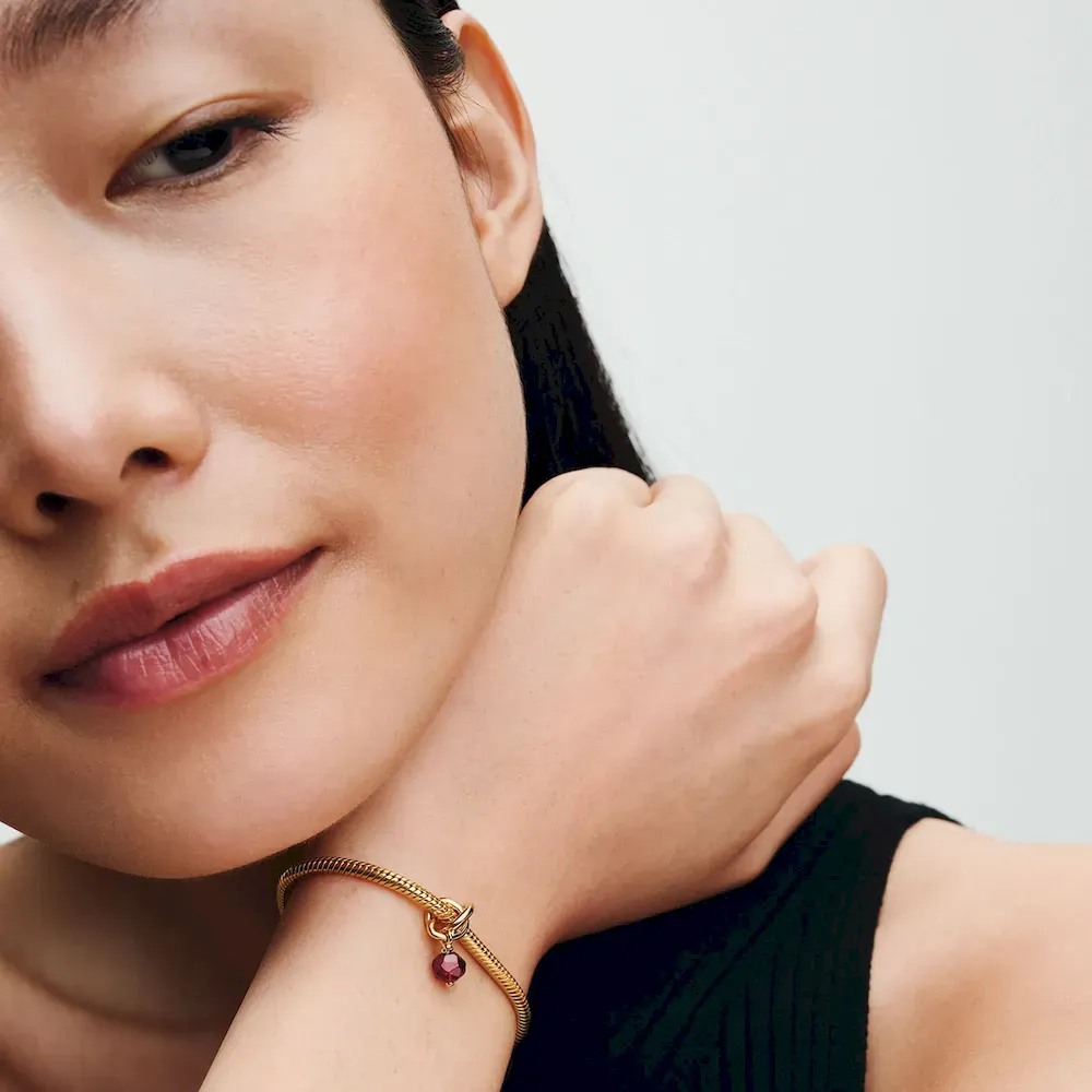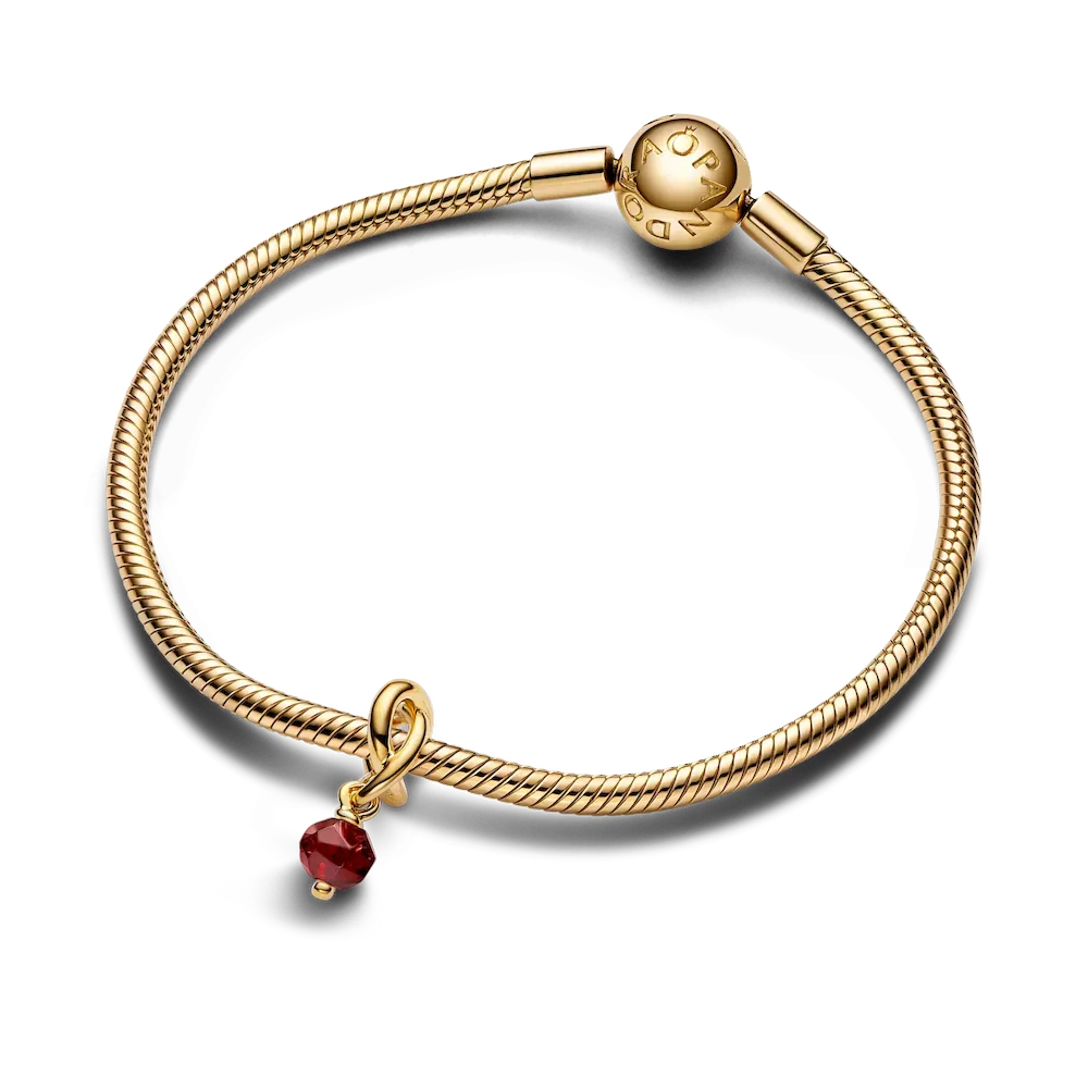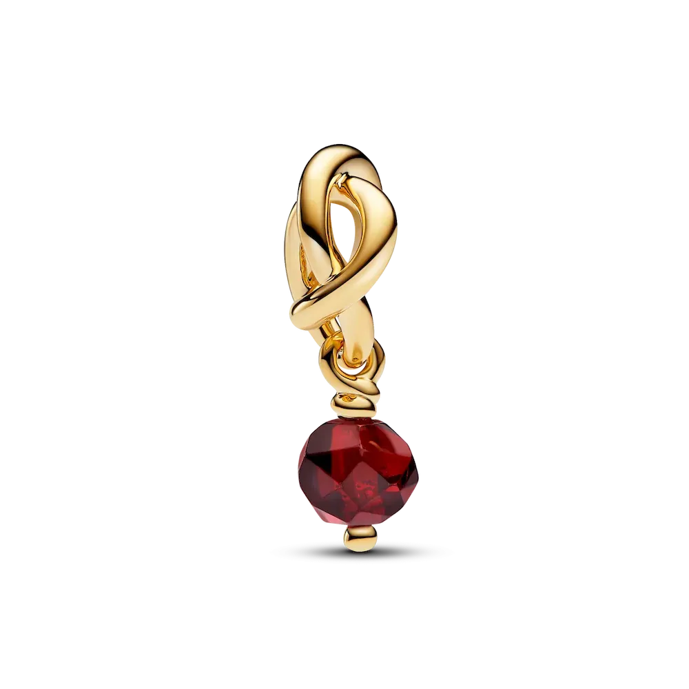 Wear a symbol of forever, that’s personal to you. This 14k gold-plated dangle charm is made up of a triple knotted circle that intertwines to resemble an infinity sign. The twist carries a faceted salsa red man-made crystal, which dangles from the charm. Wear yours to add a drop of color to your carrier, or gift it to the one you want in your life forever.