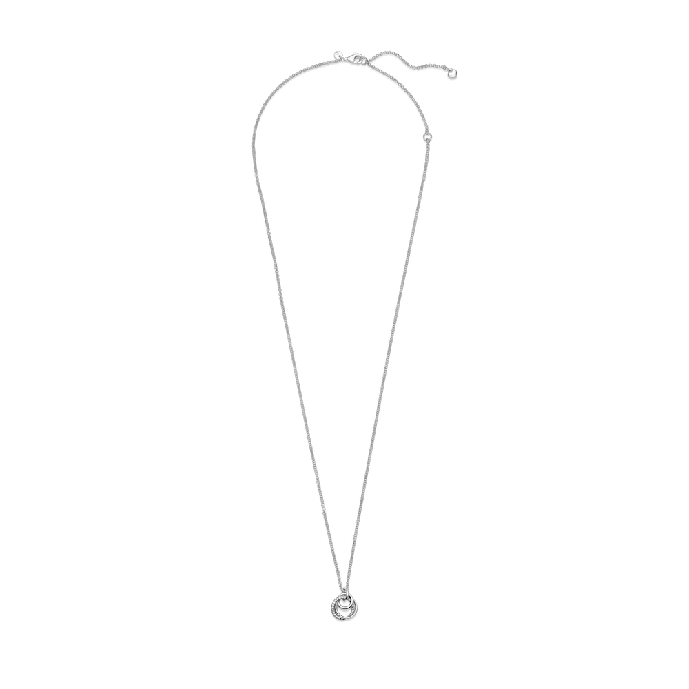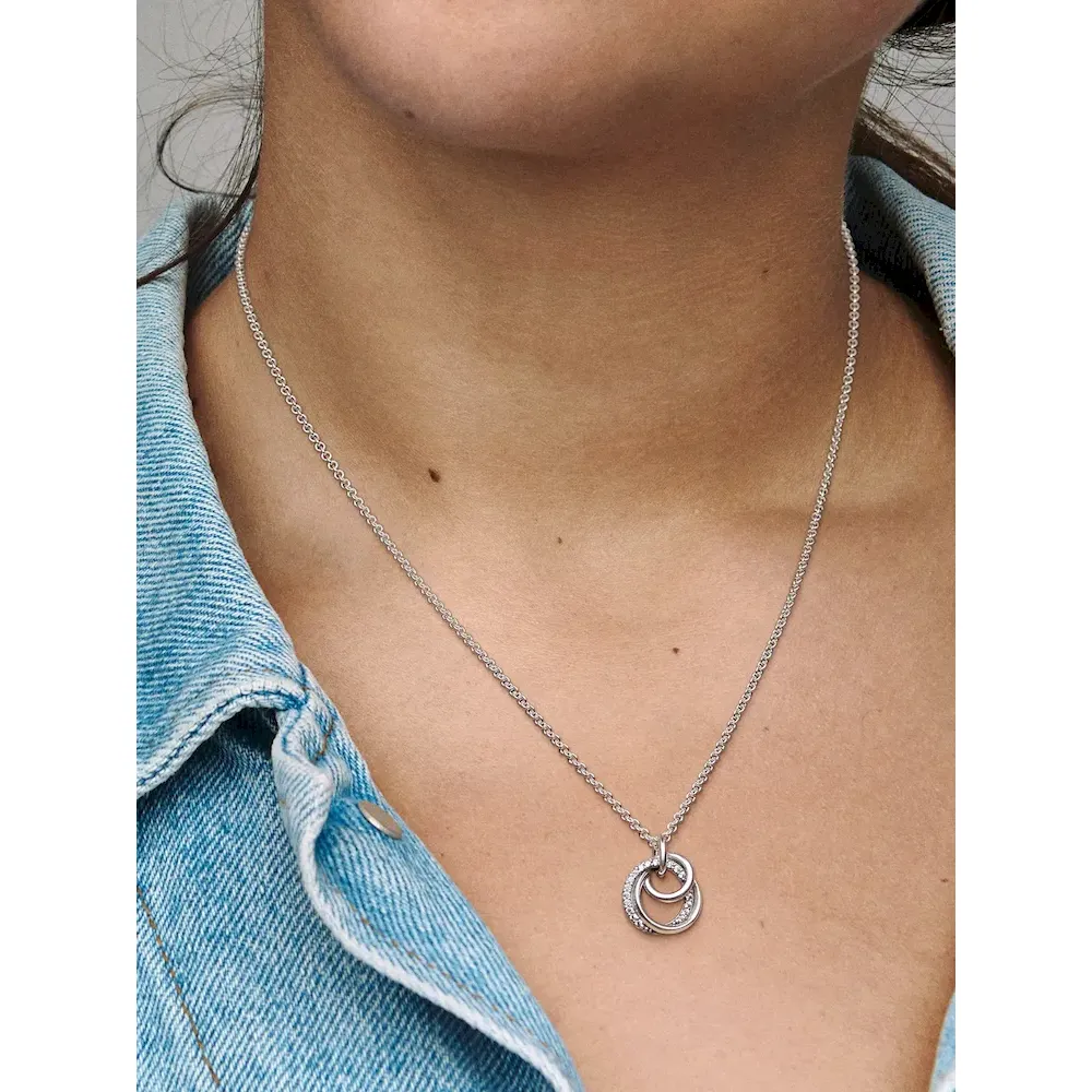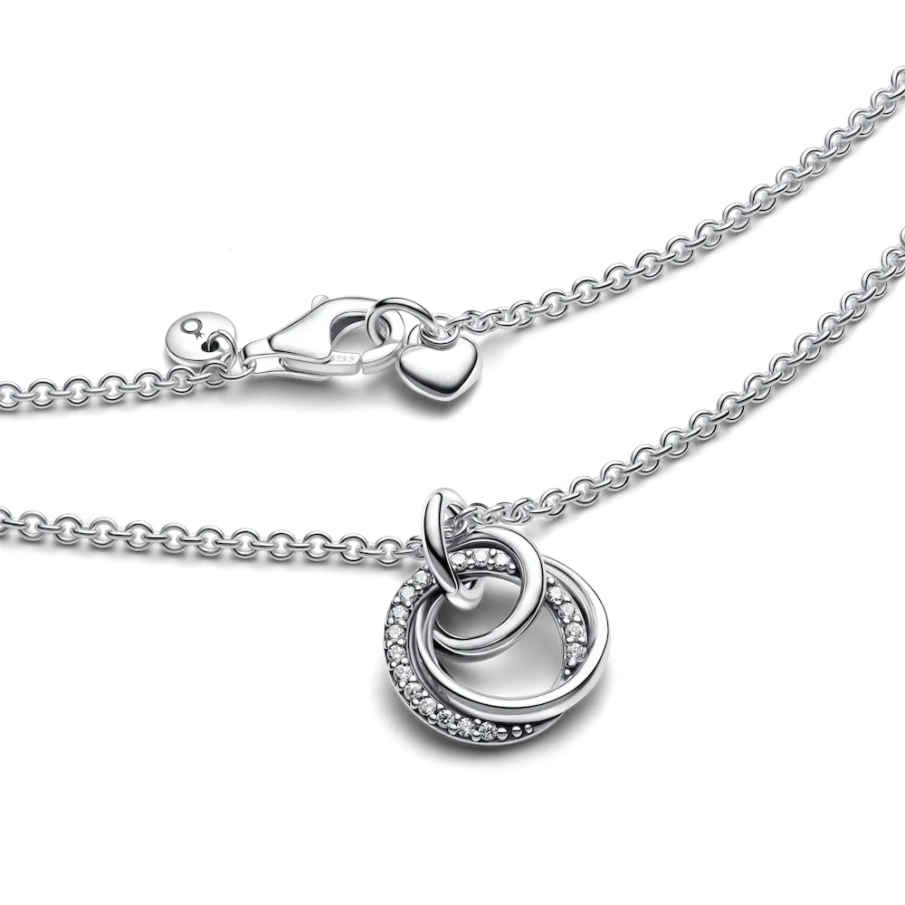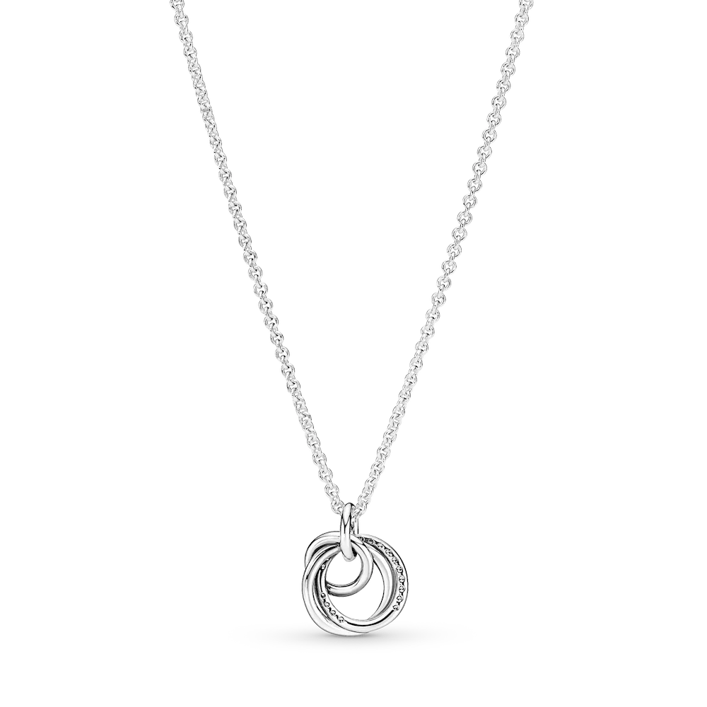A symbol of everlasting ties, the Family Always Encircled Pendant Necklace features three entwined circles in the pendant – two polished sterling silver and one sparkling cubic zirconia pavé. The closure features a small heart-shaped disc with the Pandora Crown O monogram on one side. The chain length is adjustable, making this a versatile finishing touch to your outfit.