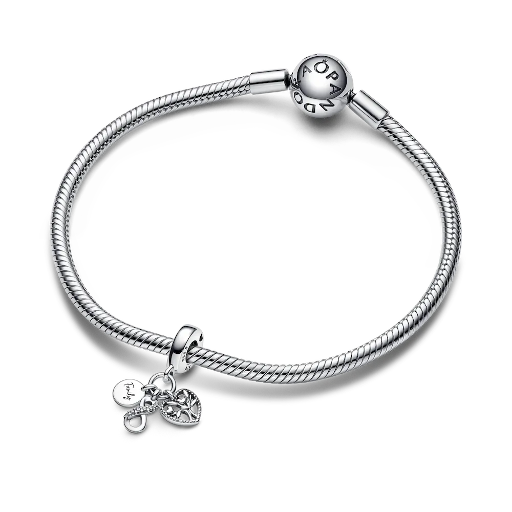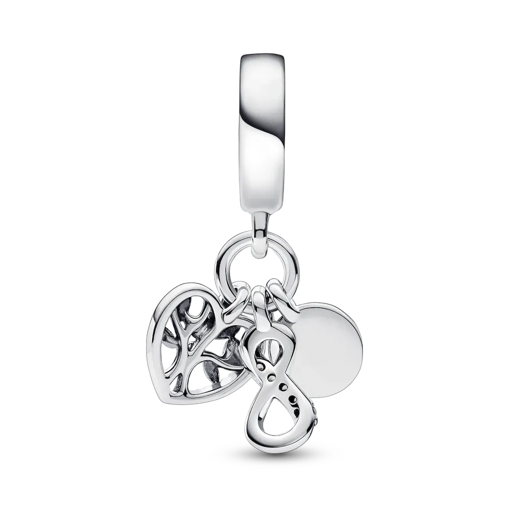 Family comes first, second and third in this triple dangle charm. Crafted in sterling silver, the Family Infinity Triple Dangle Charm features a family tree inside an openwork heart, an infinity sign decorated with sparkling pavé and a