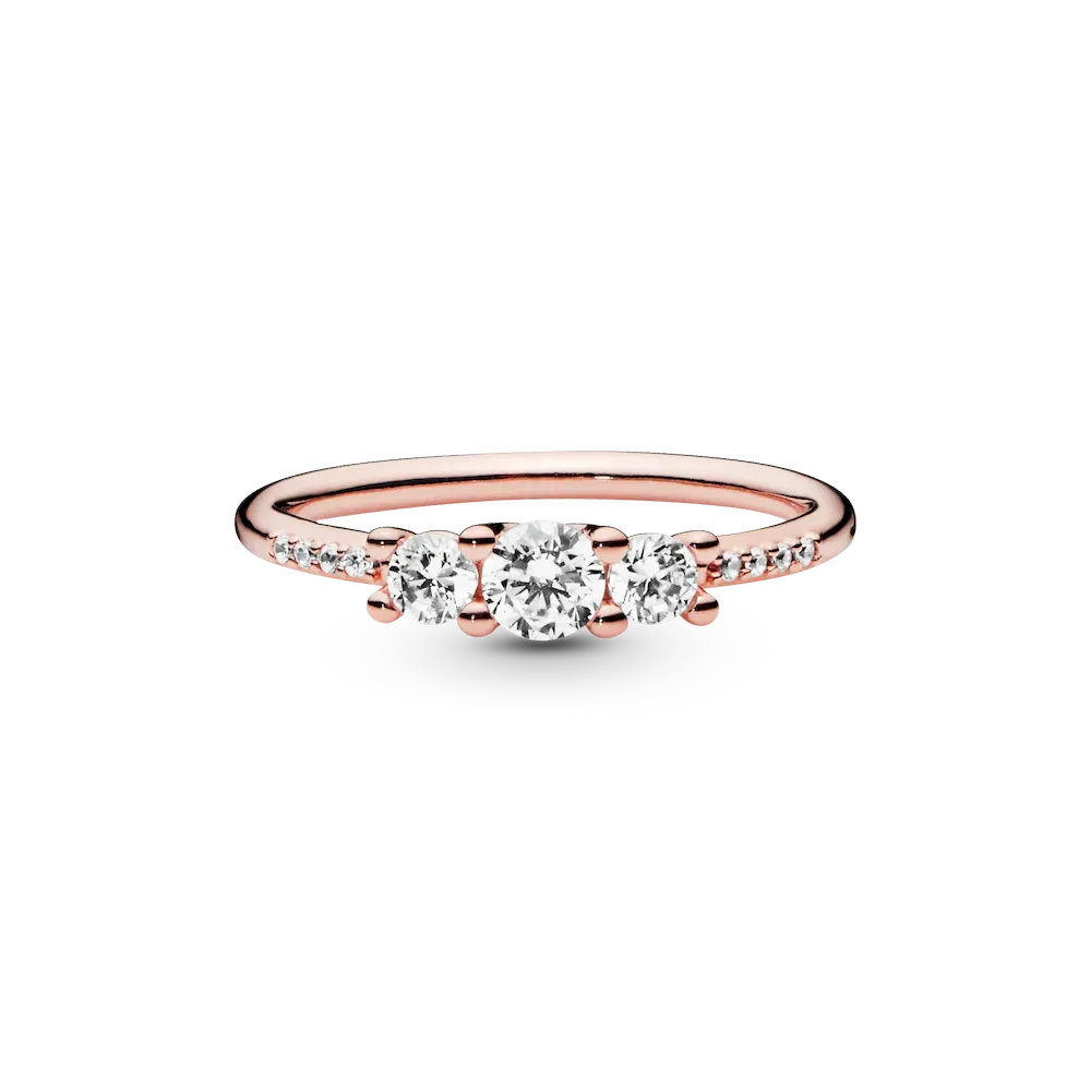 The slender band of this embellished Clear Three-Stone Ring makes it perfect for stacking with similar styles. Plated with 14k rose gold for a blush pink finish, it channels the look and feel of vintage styles. This classic ring makes a beautiful gift as a promise ring for a special someone.