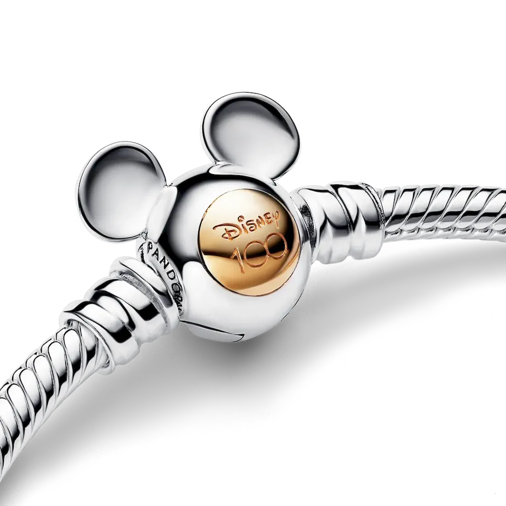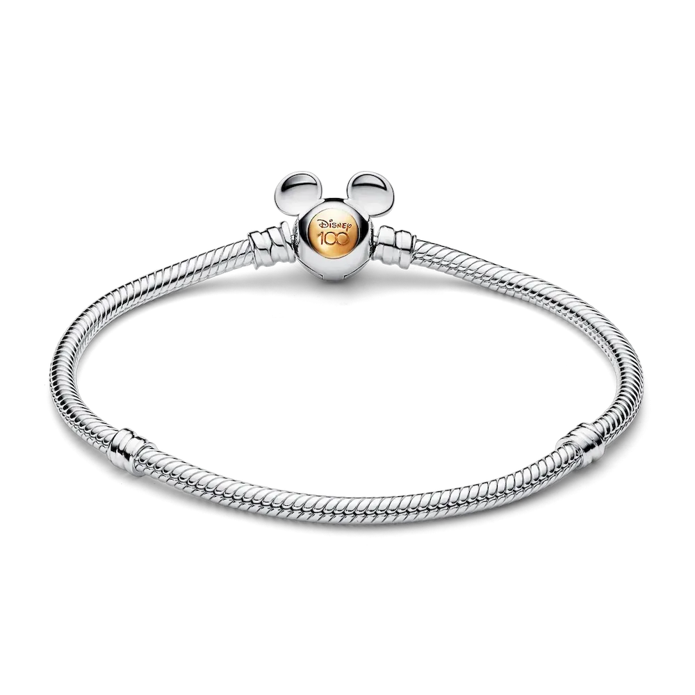 Make precious memories last forever with our Disney 100th Anniversary Moments Snake Chain Bracelet. Hand-finished in sterling silver, this limited edition collector’s piece features a Mickey Mouse-shaped clasp with a 14k gold circle engraved with “Disney 100”. Style it with your favourite Disney x Pandora charms to celebrate 100 years of wonder.