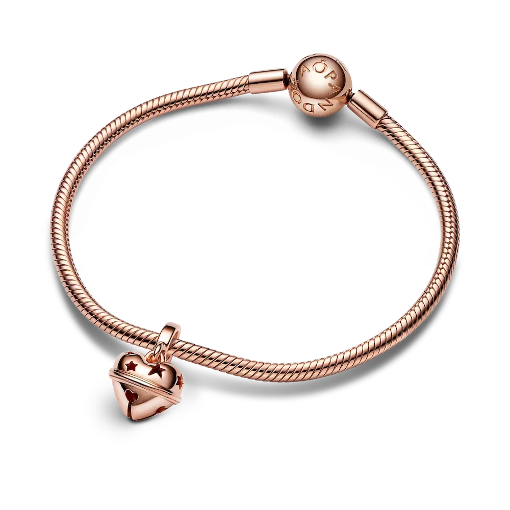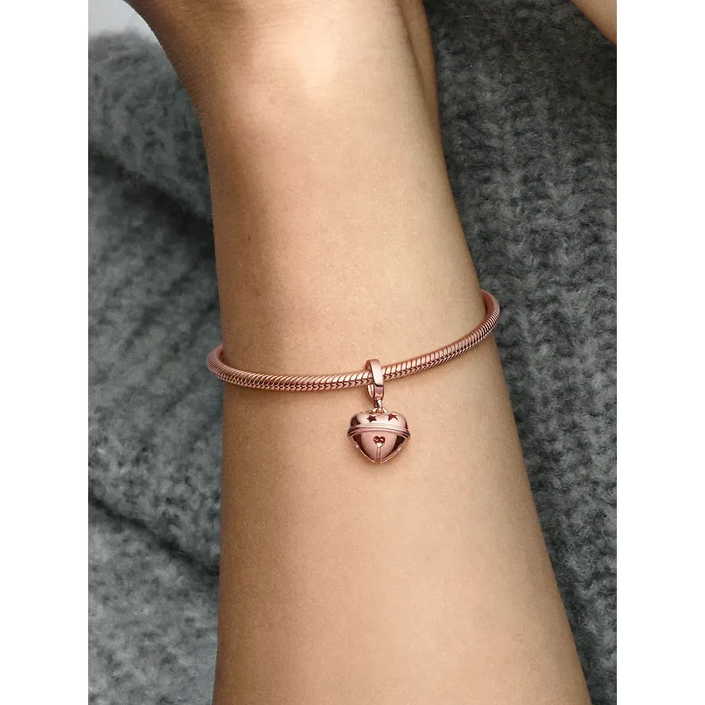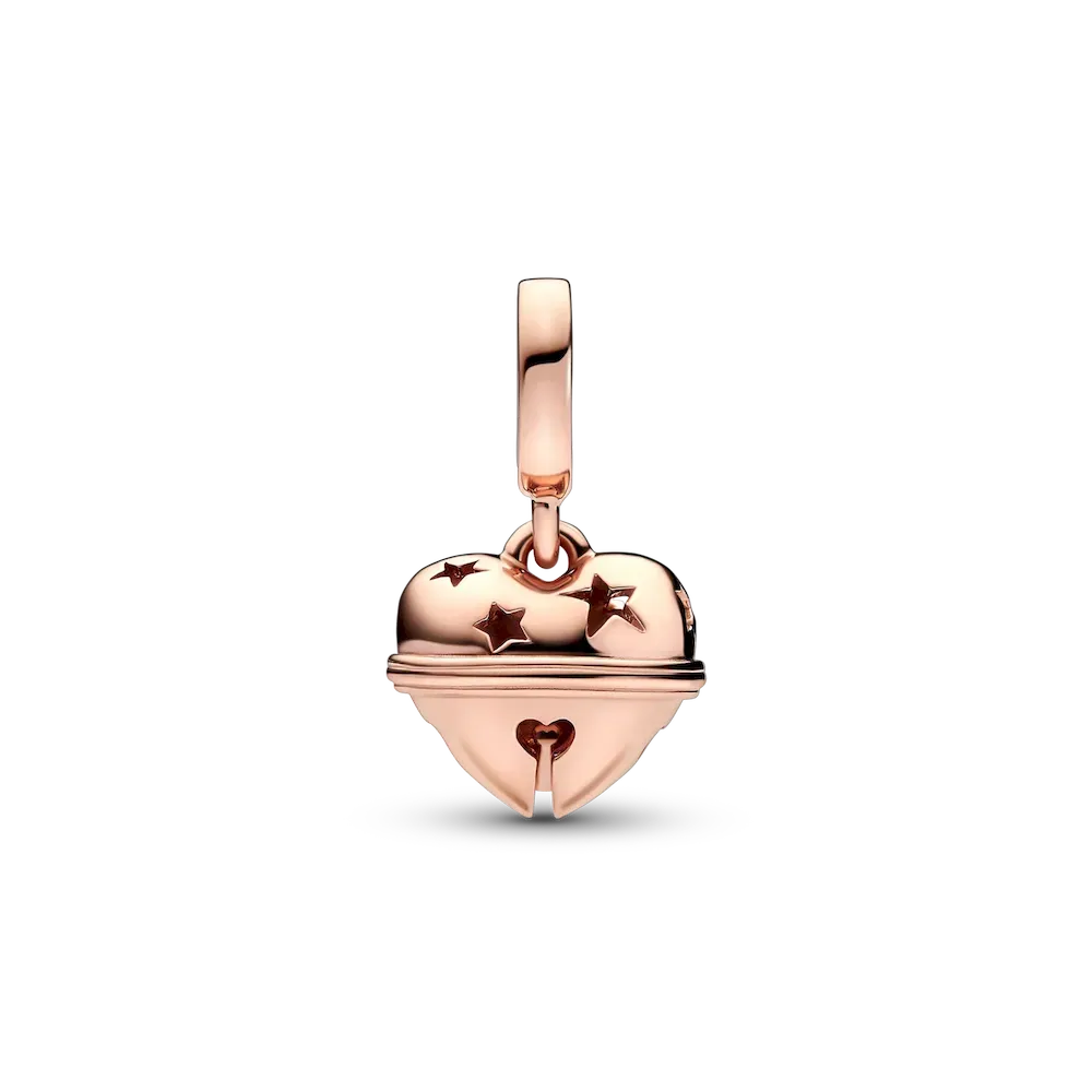 Do you hear sleigh bells? The Festive Bell Dangle Charm brings an element of sound to your festive jewelry looks. A classic holiday motif with a Pandora twist, the 14k rose gold-plated bell charm is shaped like a heart with star-shaped cut-outs and makes a gentle jingling sound when you shake it. The opening on the bottom of the bell finishes with four cut-out heart shapes, symbolizing the love and togetherness of the season. Set the mood for a joyous celebration with the cheerful sound of bells.