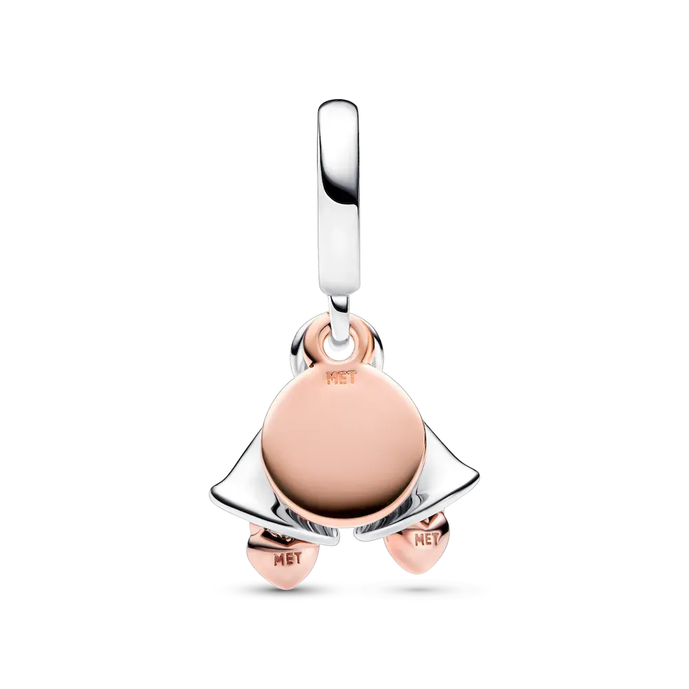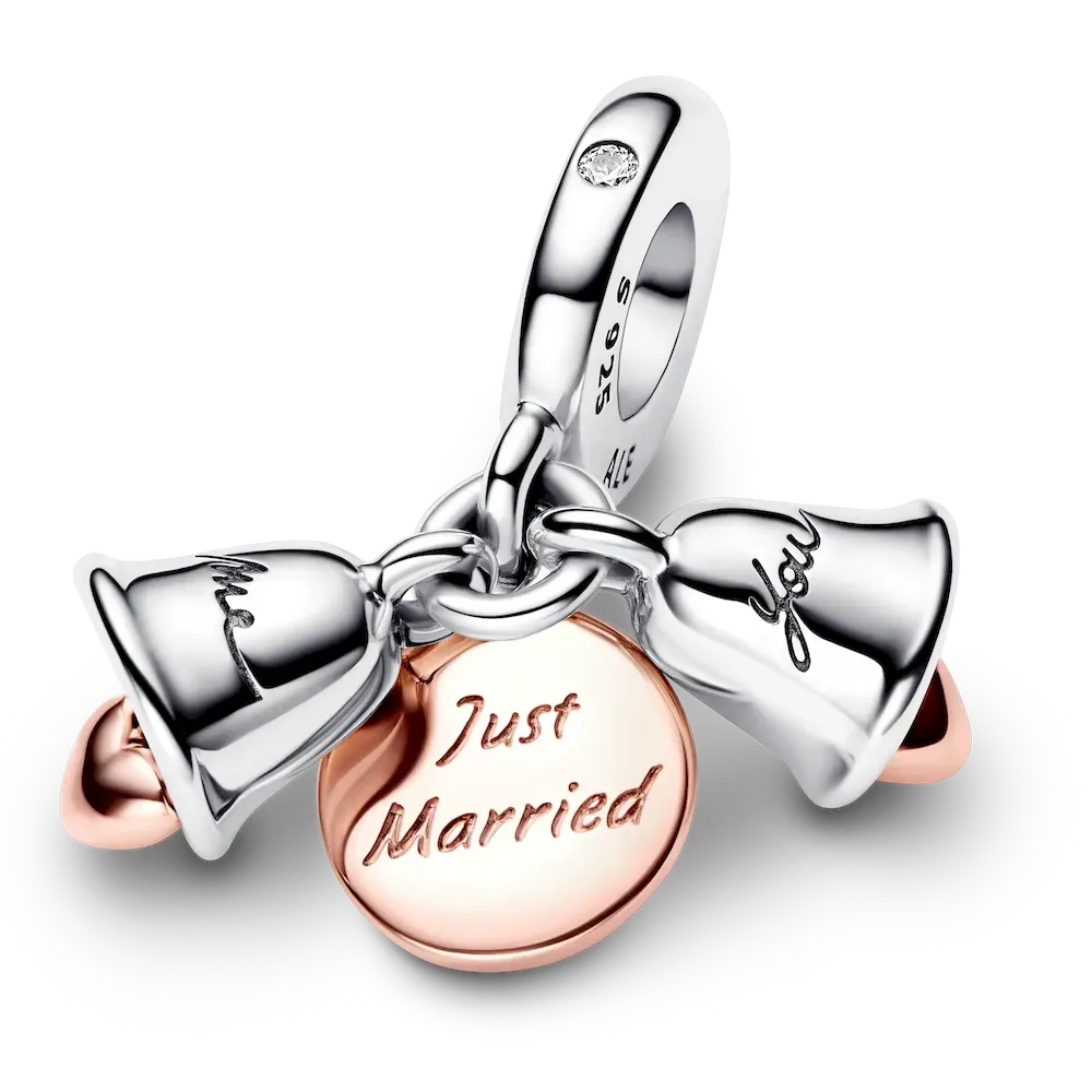 Let the bells ring for the happy couple! The Two-tone Wedding Bells Double Dangle Charm is a celebration of a new milestone in your love story. It features two dangling wedding bells in sterling silver, each with a small 14k rose gold-plated heart dangle inside – one bell is engraved with