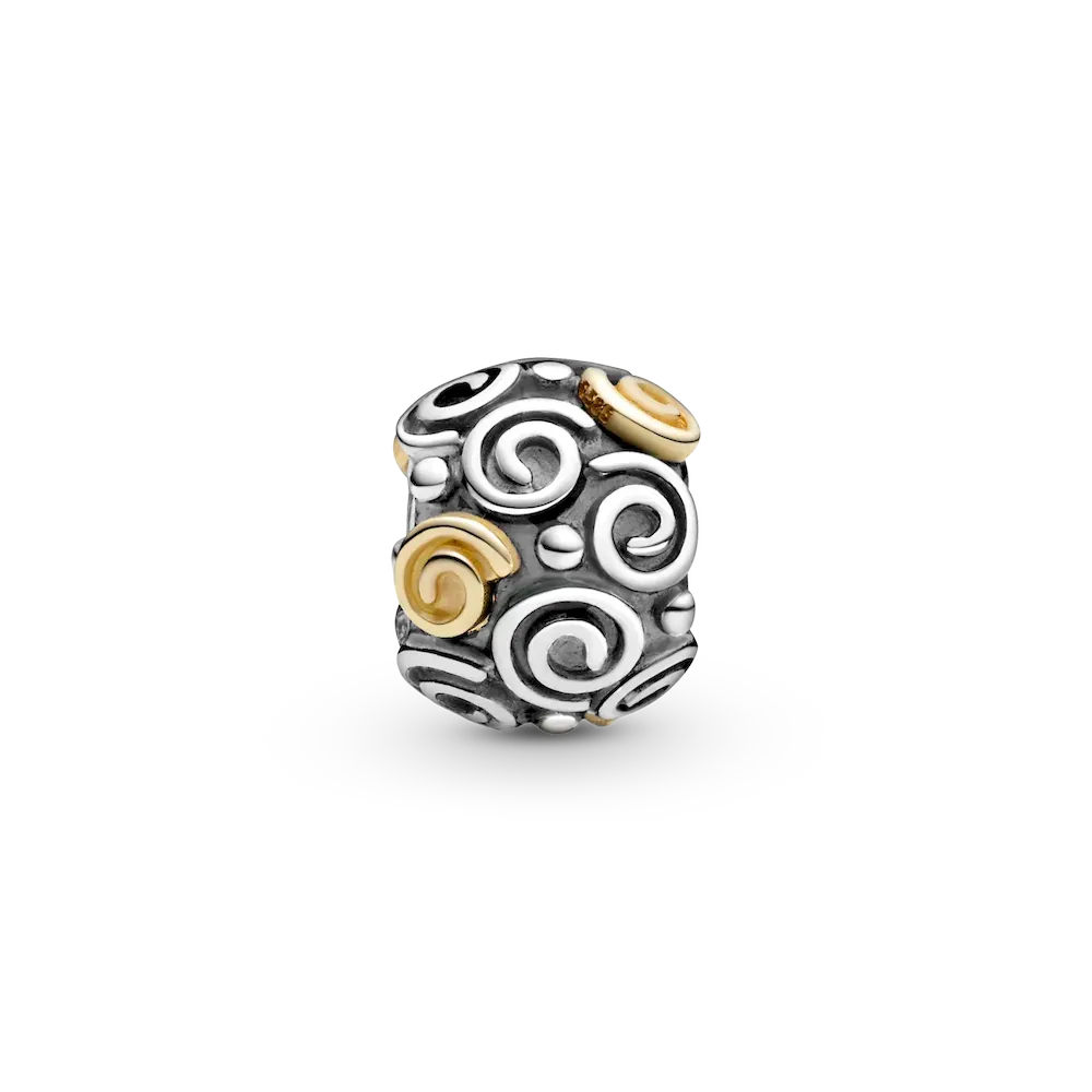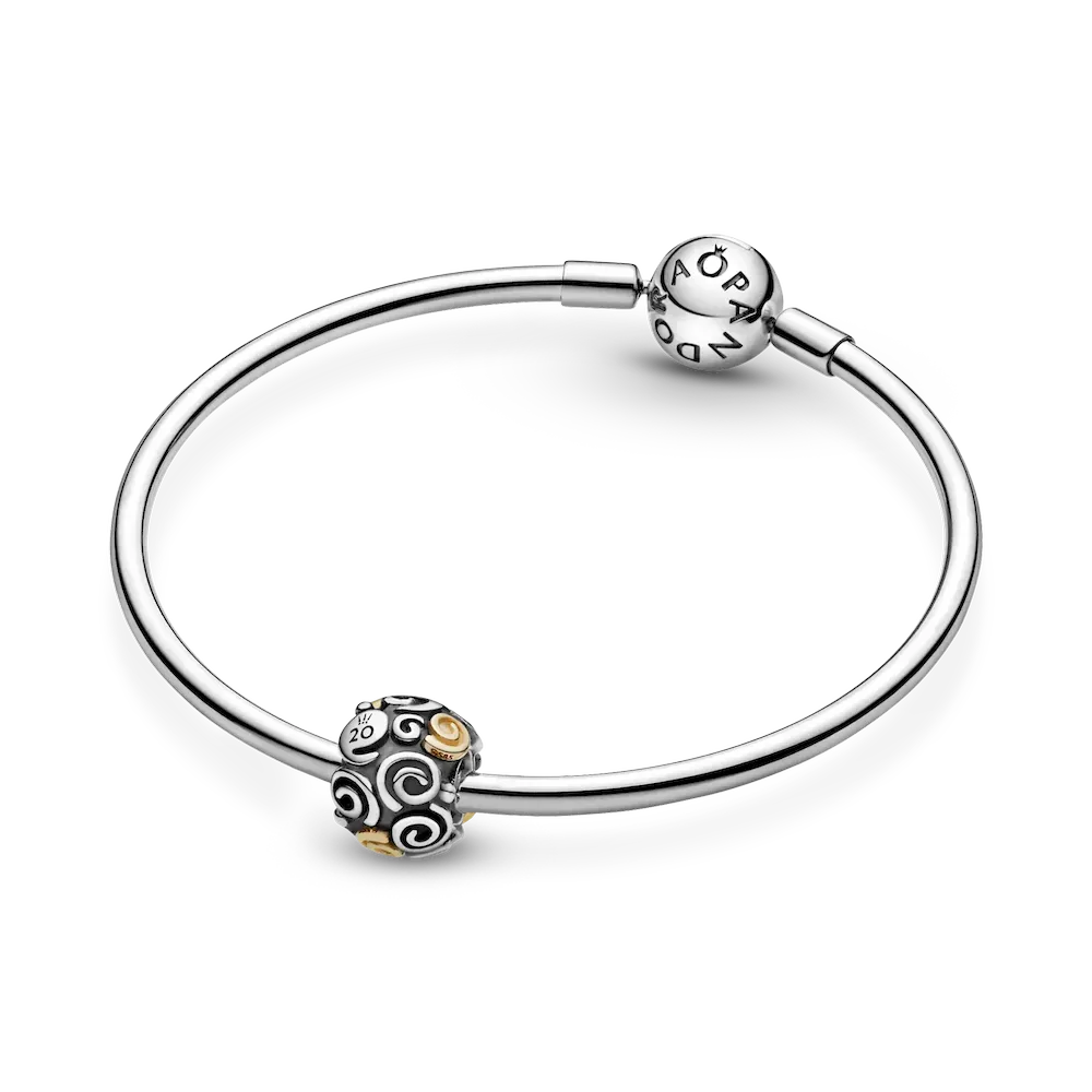 Mark 20 years of collecting Pandora Moments charms with the Pandora 2020 Limited Edition Swirl Charm. Hand-finished in sterling silver and 14k gold, this design is a reinterpretation of a piece from our archives. A few of the charm’s raised swirls feature solid 14k gold and are set amongst sterling silver swirls for an eye-catching two-tone finish. Including a special 20th anniversary logo engraving, express your passion for collecting with this symbolic swirl charm. Style with sterling silver charms on your bracelet to let this piece stand out.