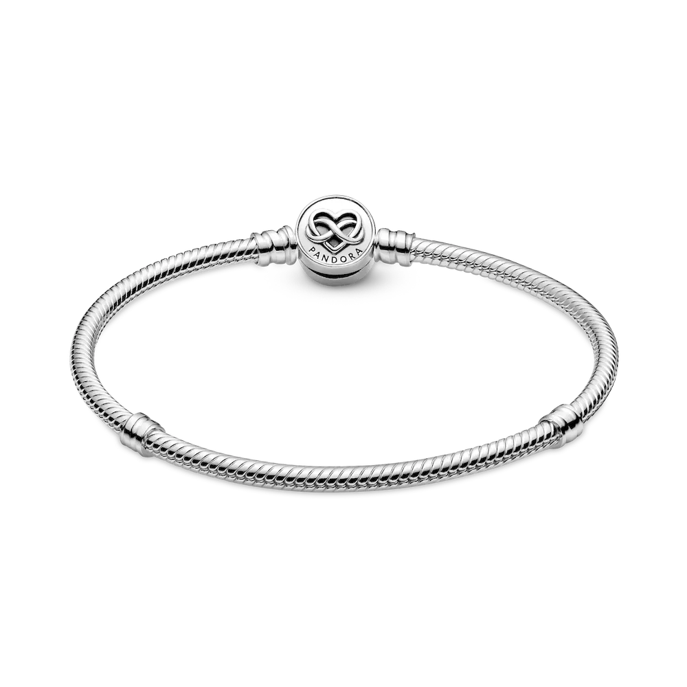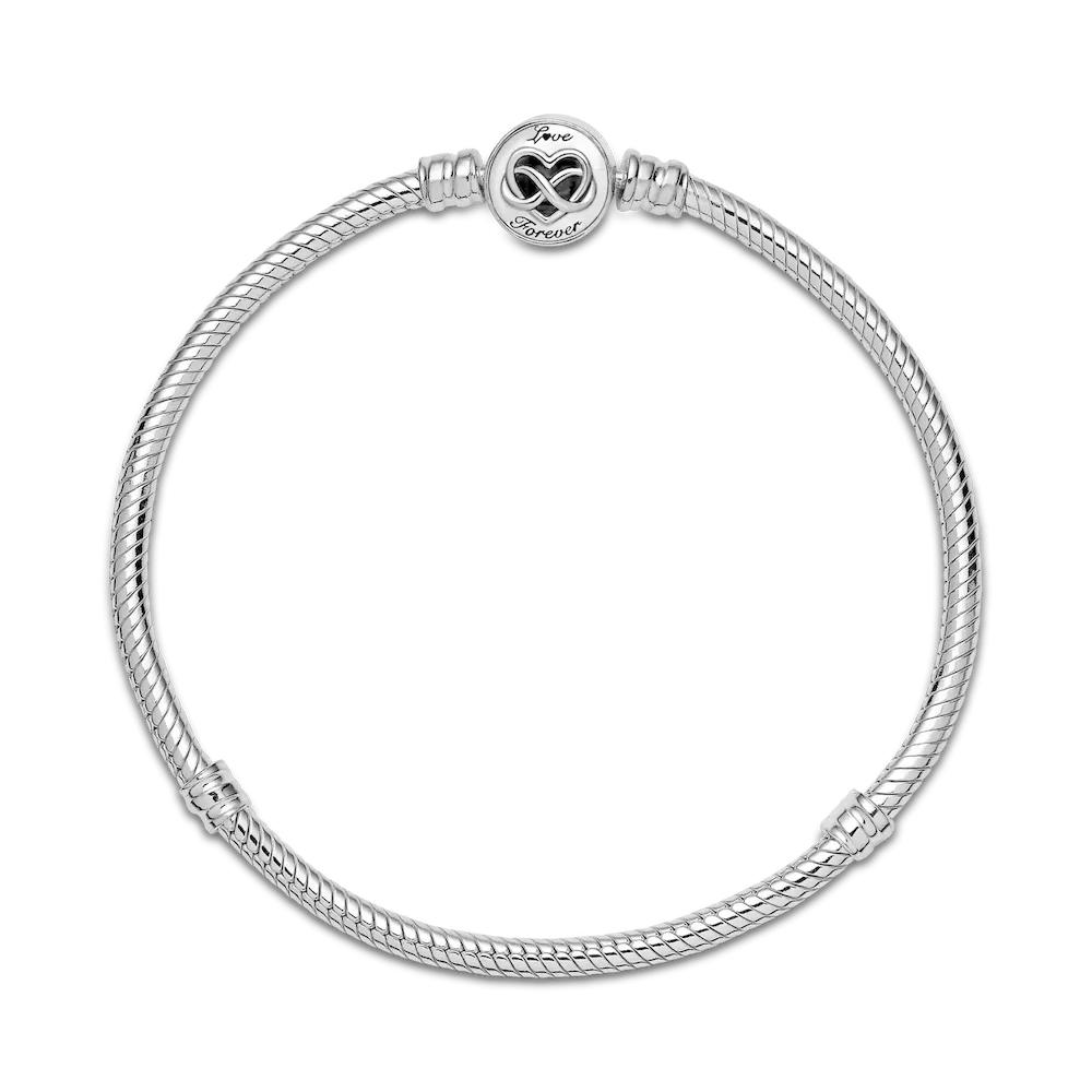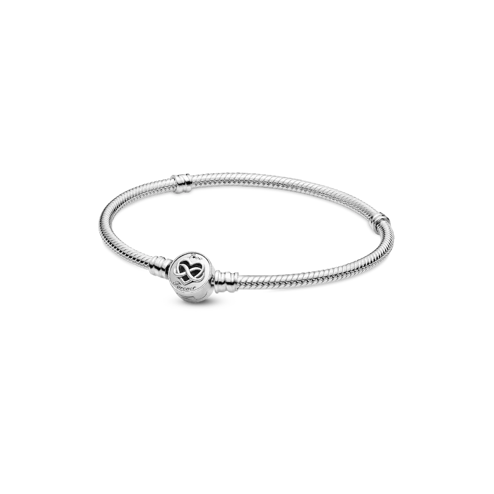 Gift a symbol of your love with the Pandora Moments Heart Infinity Clasp Snake Chain Bracelet. Hand-finished in sterling silver, this design includes a round flat clasp and our popular snake chain. An openwork heart with an entwined infinity symbol and the engraving “Love Forever” feature on the front, with a raised heart and infinity motif on the back. This bracelet includes threaders and stoppers to keep much-loved charms in place. Gift this style to someone special to show how much you care.