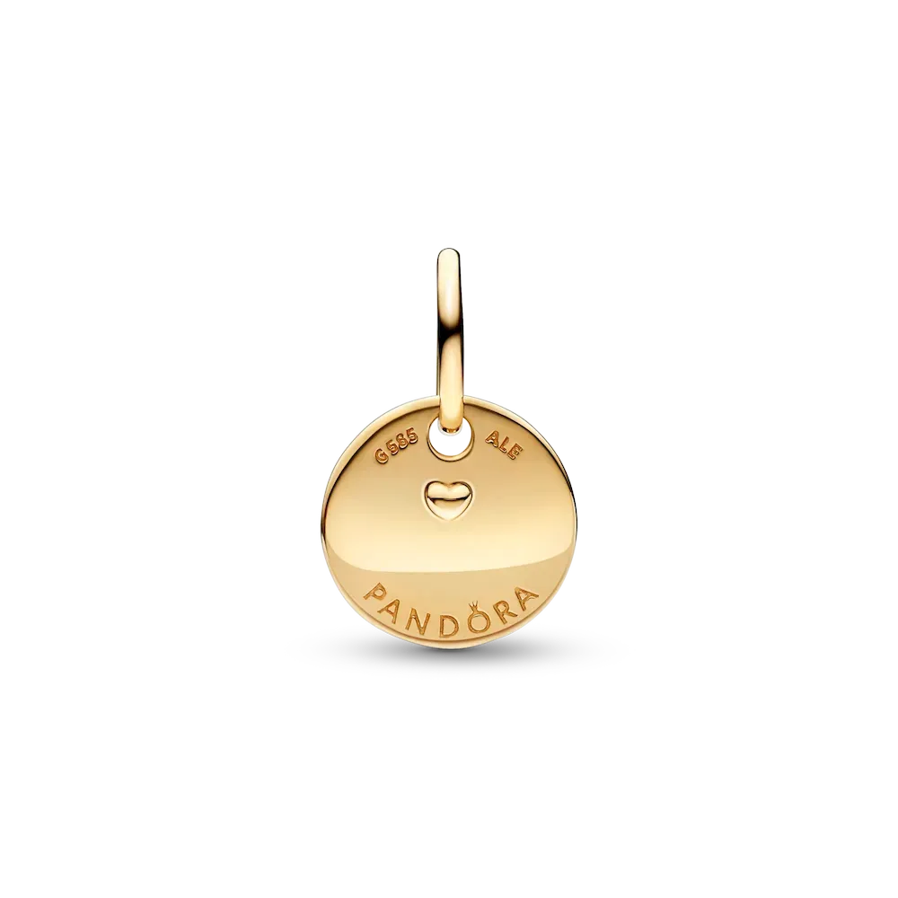 An emblem of peace, love and luck to carry with you always. This 14k solid gold charm features a round disc-shaped dangle with the engraved words
