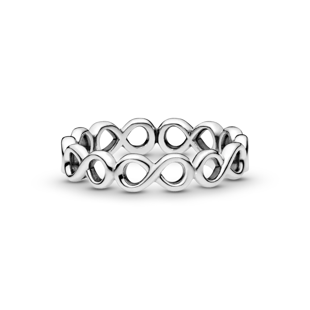 Make this understated band ring your next forever piece. Cast from our signature sterling silver metal, this band ring is sculpted into openwork infinity symbols that wrap elegantly around your finger. The simple style works equally well alone or as part of a personal ring stack. It also makes a beautiful gift to show her that you know her – forever and always.