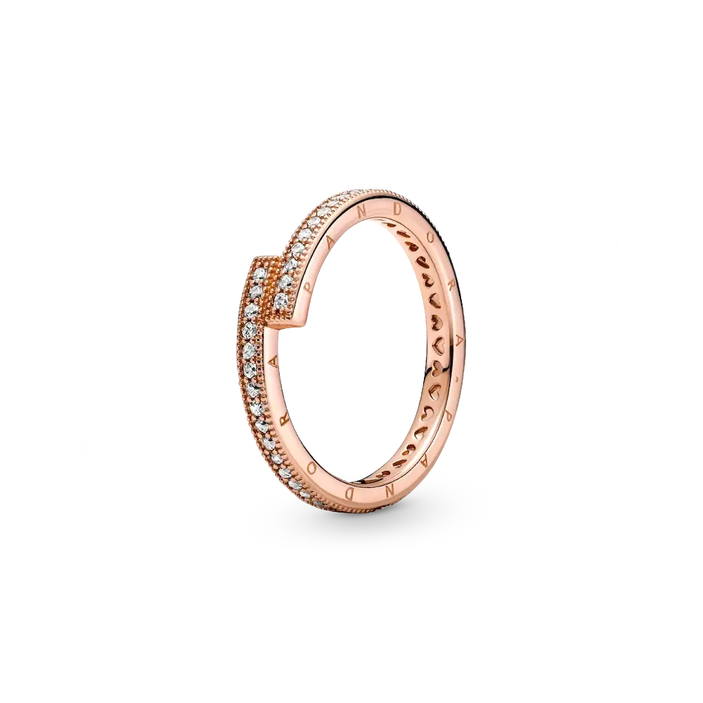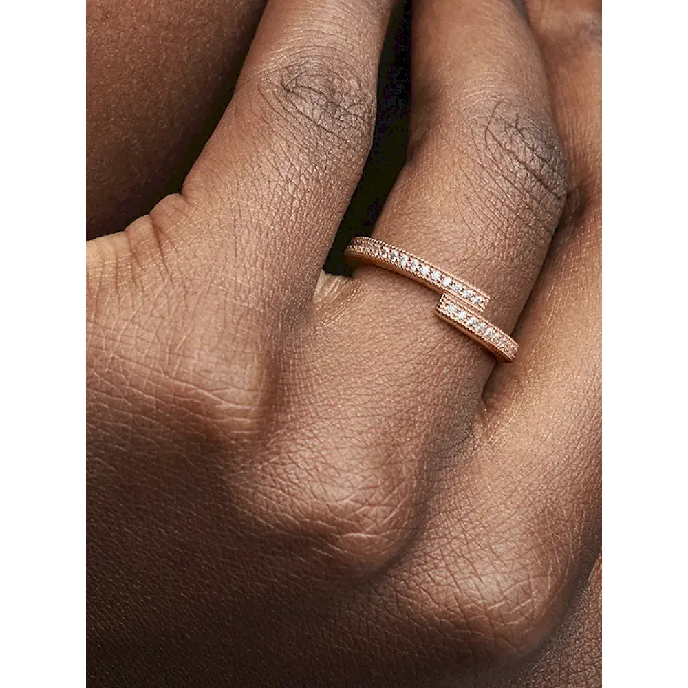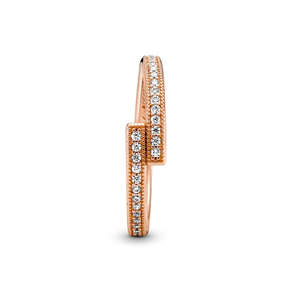 Opt for modern minimalism with the Sparkling Overlapping Ring. This hand-finished, 14k rose gold-plated ring features an asymmetrical design where the square ends of the band slightly overlap to create 90-degree angles. The outer band features clear cubic zirconia pavé framed by micro-beading, the sides have the Pandora logo and the inner shank has cut-out hearts. There are two Pandora Crown O monograms at the end of each profile. Subtly stunning on its own or show-stopping when multiple are stacked together, this ring makes a clean, chic statement.